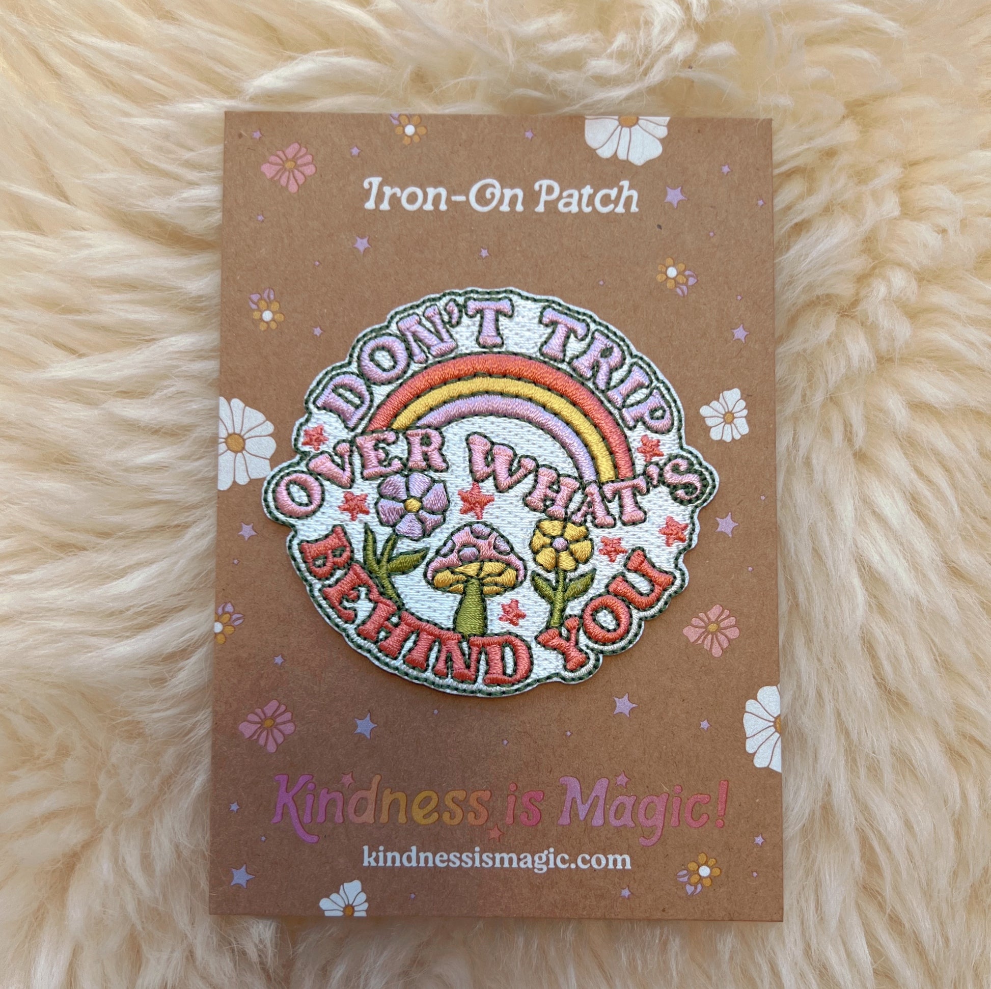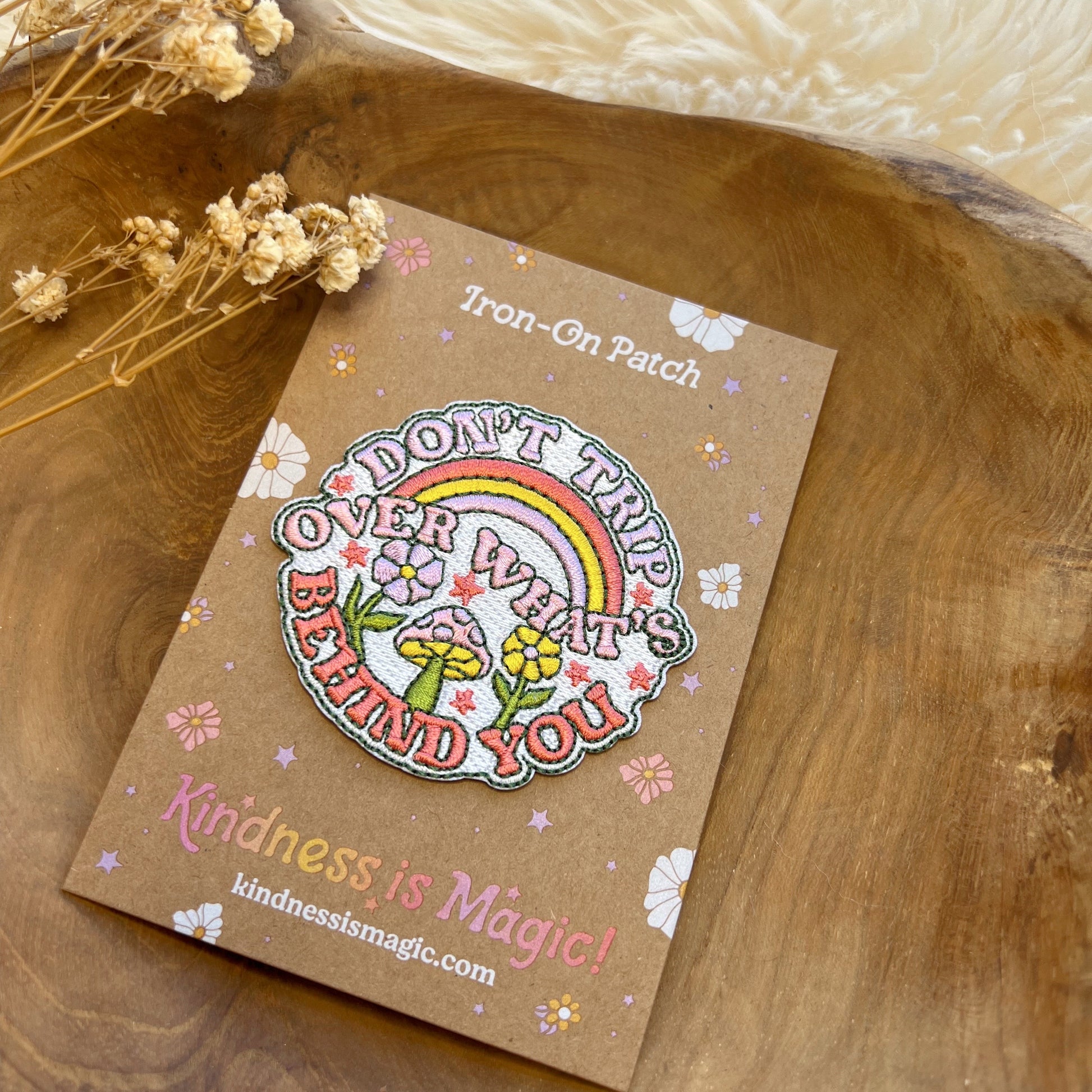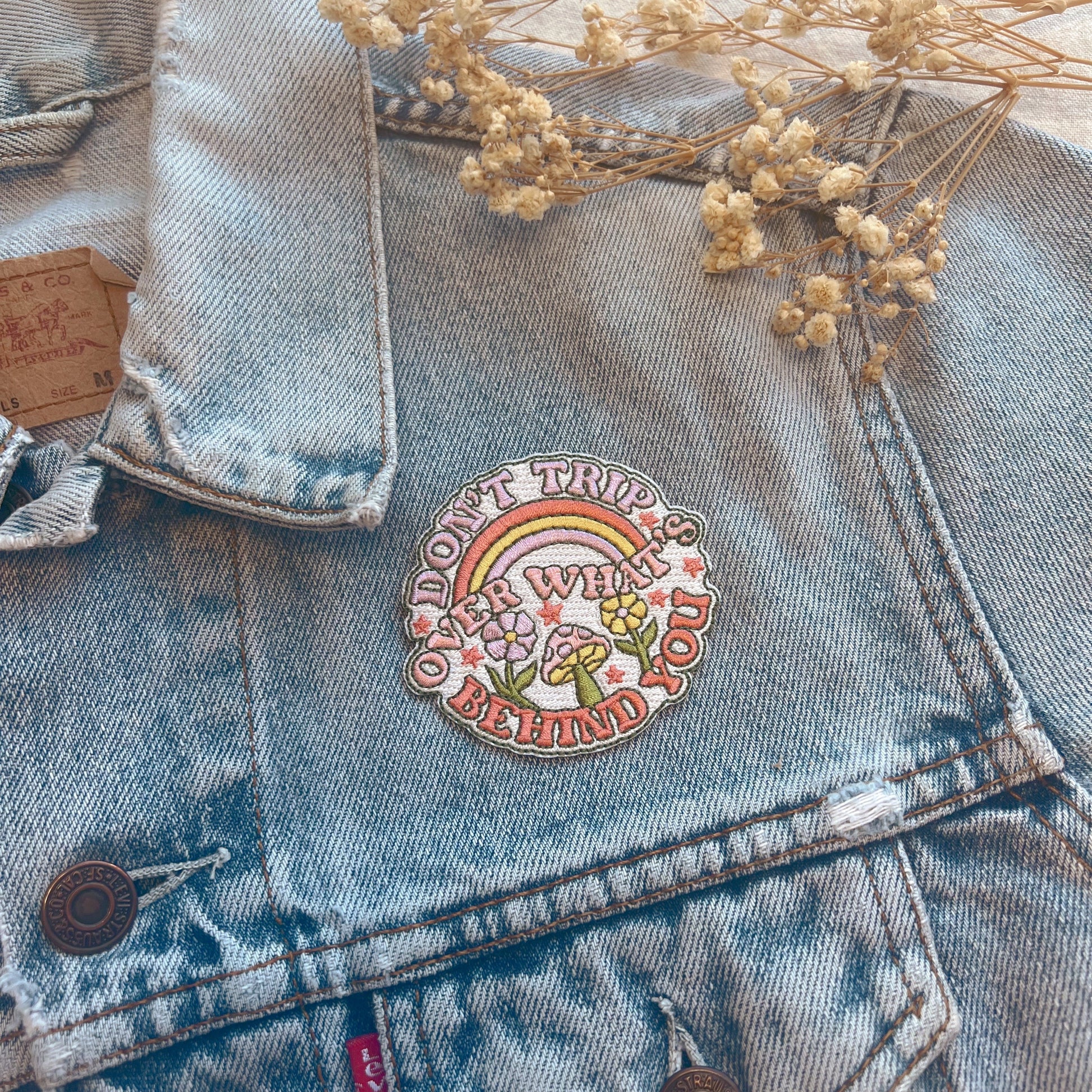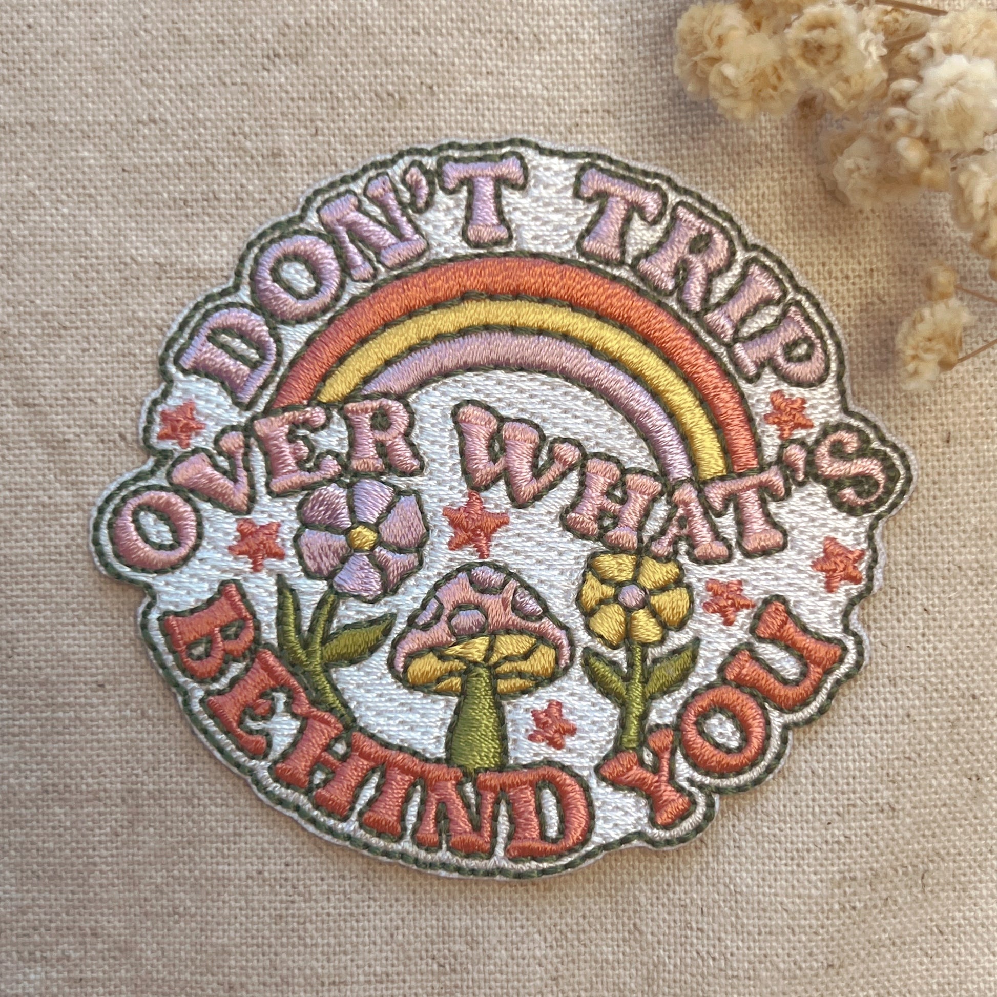 Here's a daily affirmation: Don't Trip Over What's Behind You! Our embroidered, iron on patch features a kind reminder embroidered with flowers, mushrooms, tiny stars and the rainbow after the storm has ended!