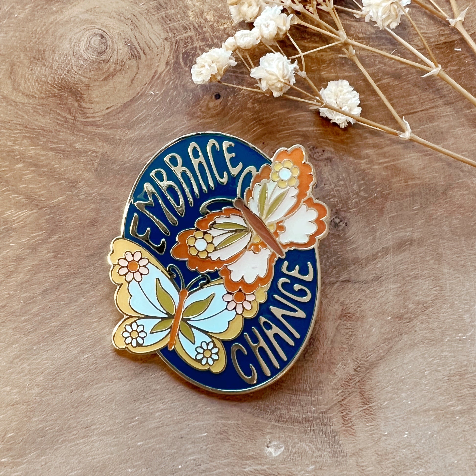 This butterfly pin reminds you to Embrace Change! Hard enamel pin features a midnight navy & amber palette detailed with butterflies that have little nature motifs and daisies on their fluttering wings. Crafted in enamel, soft gold tone trim, & a clear epoxy coating.