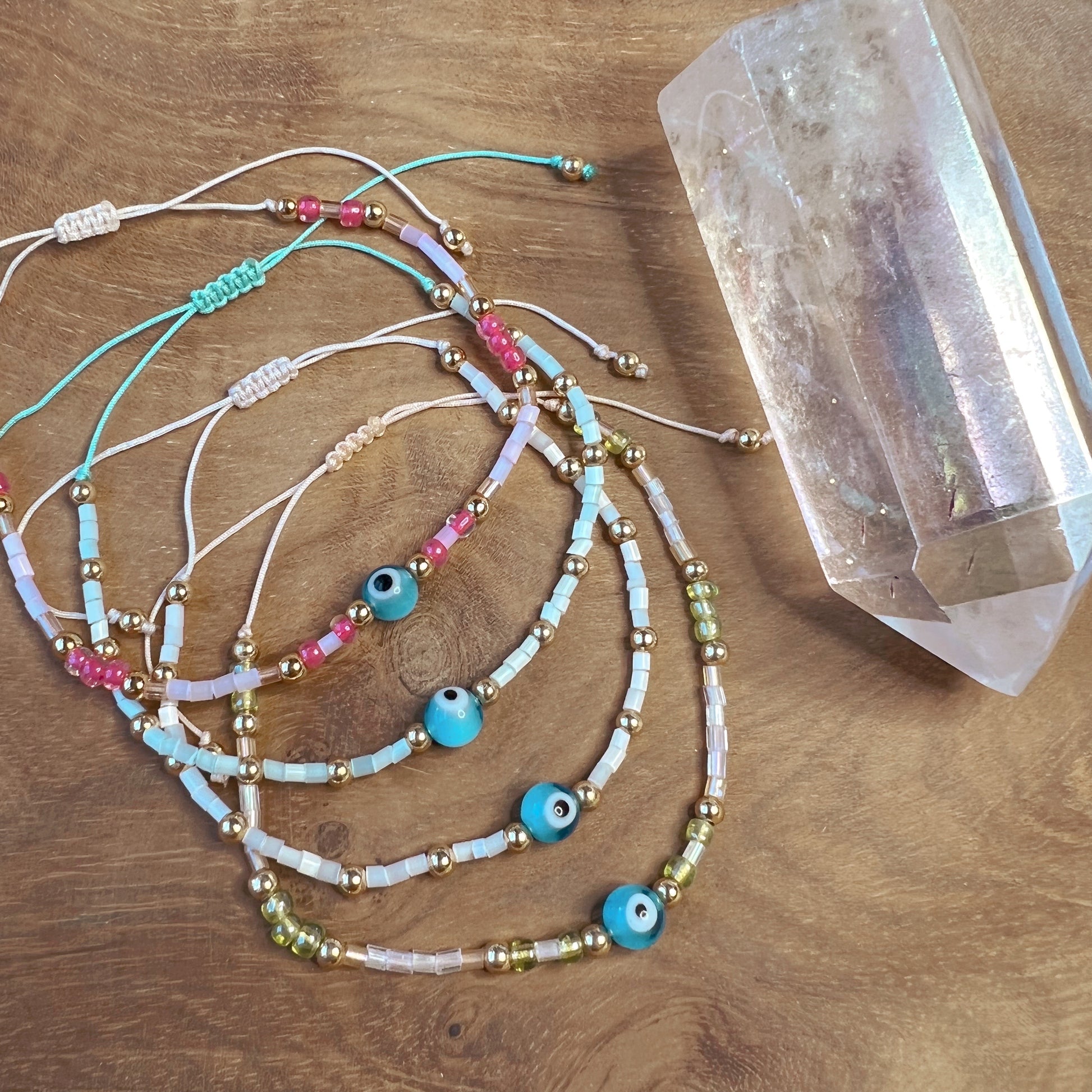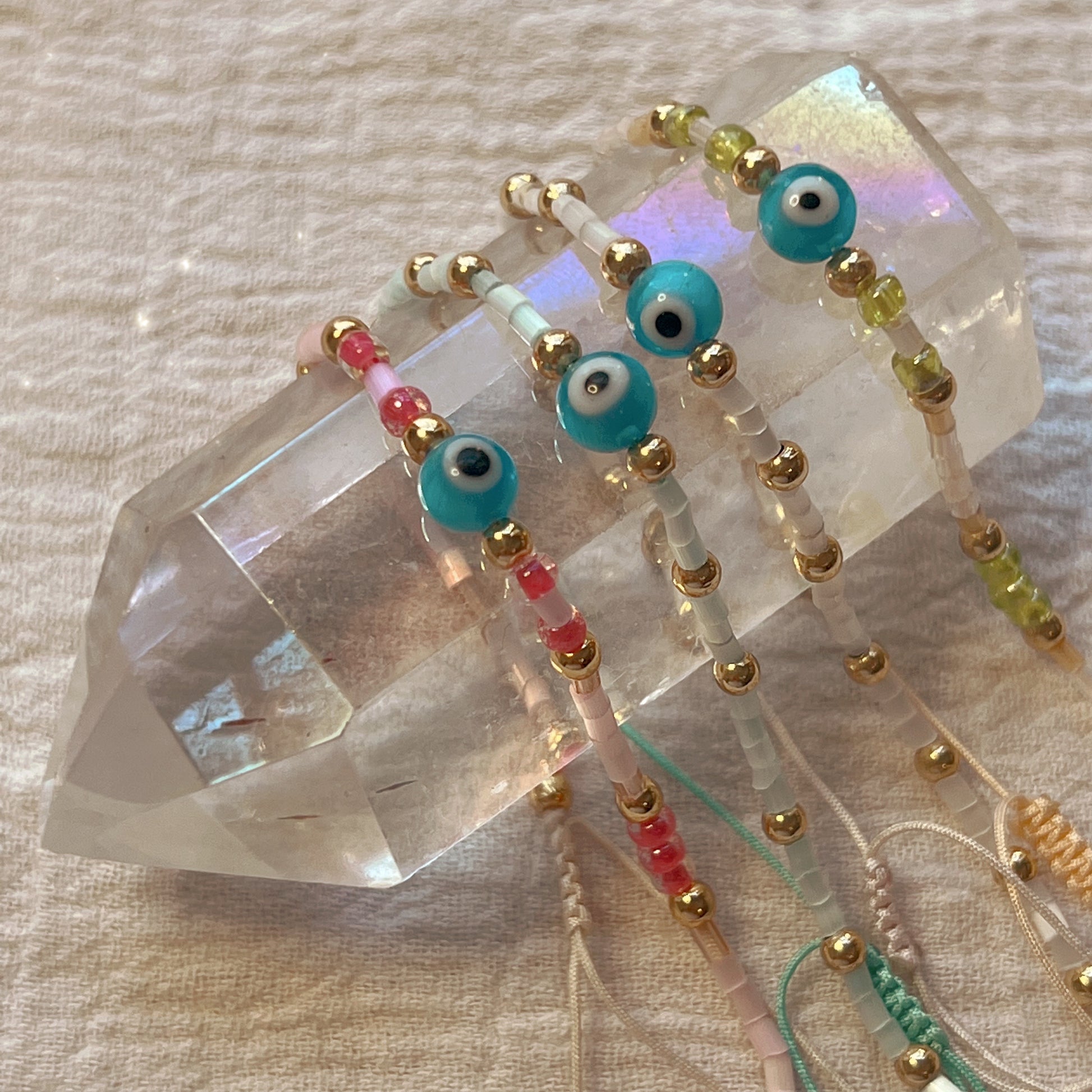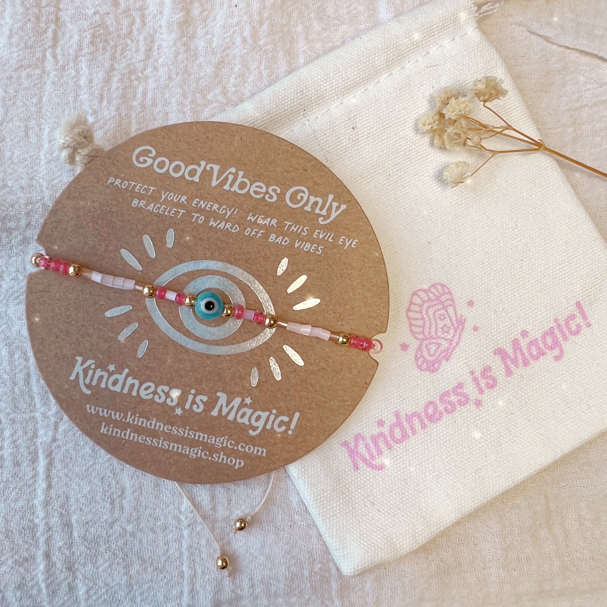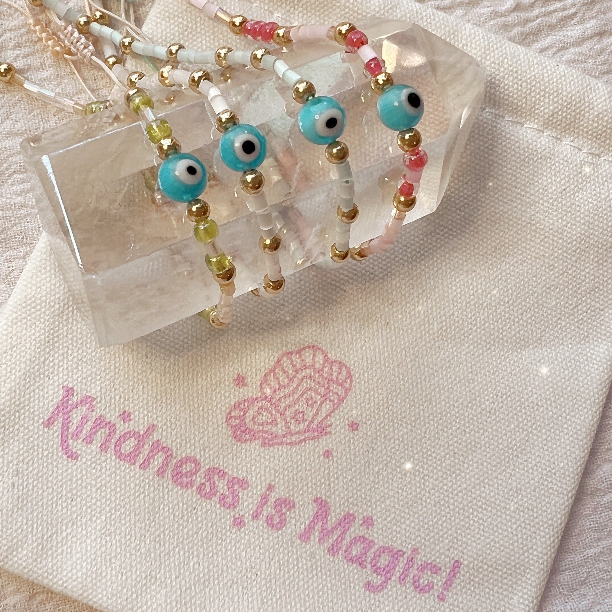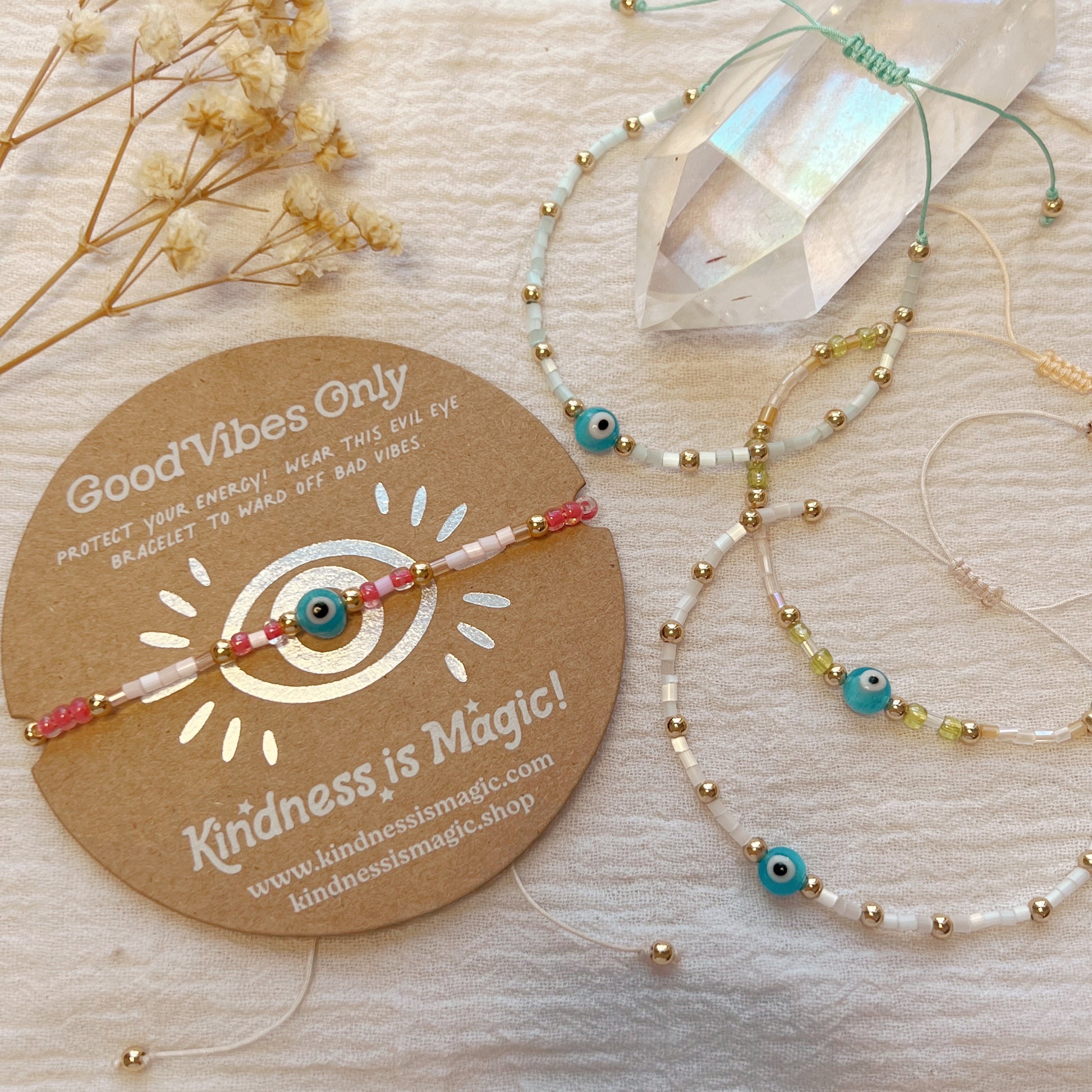 Good vibes only with our beaded evil eye bracelet! Packaged on an inspirational card that makes this a great gift. Available in pink multi, shimmery white, soft aqua, or light green / tan.