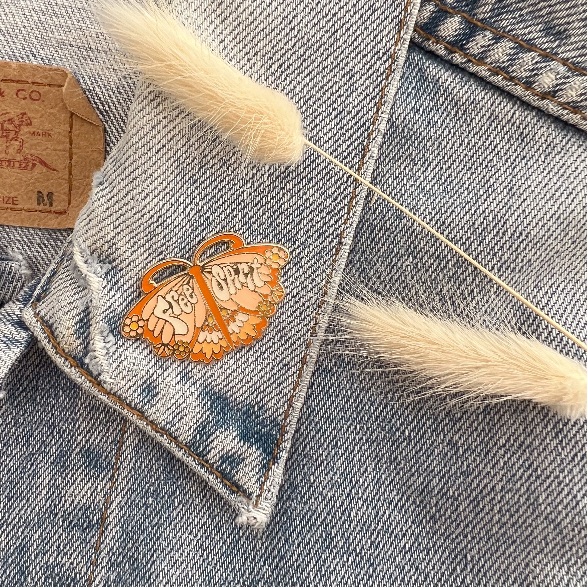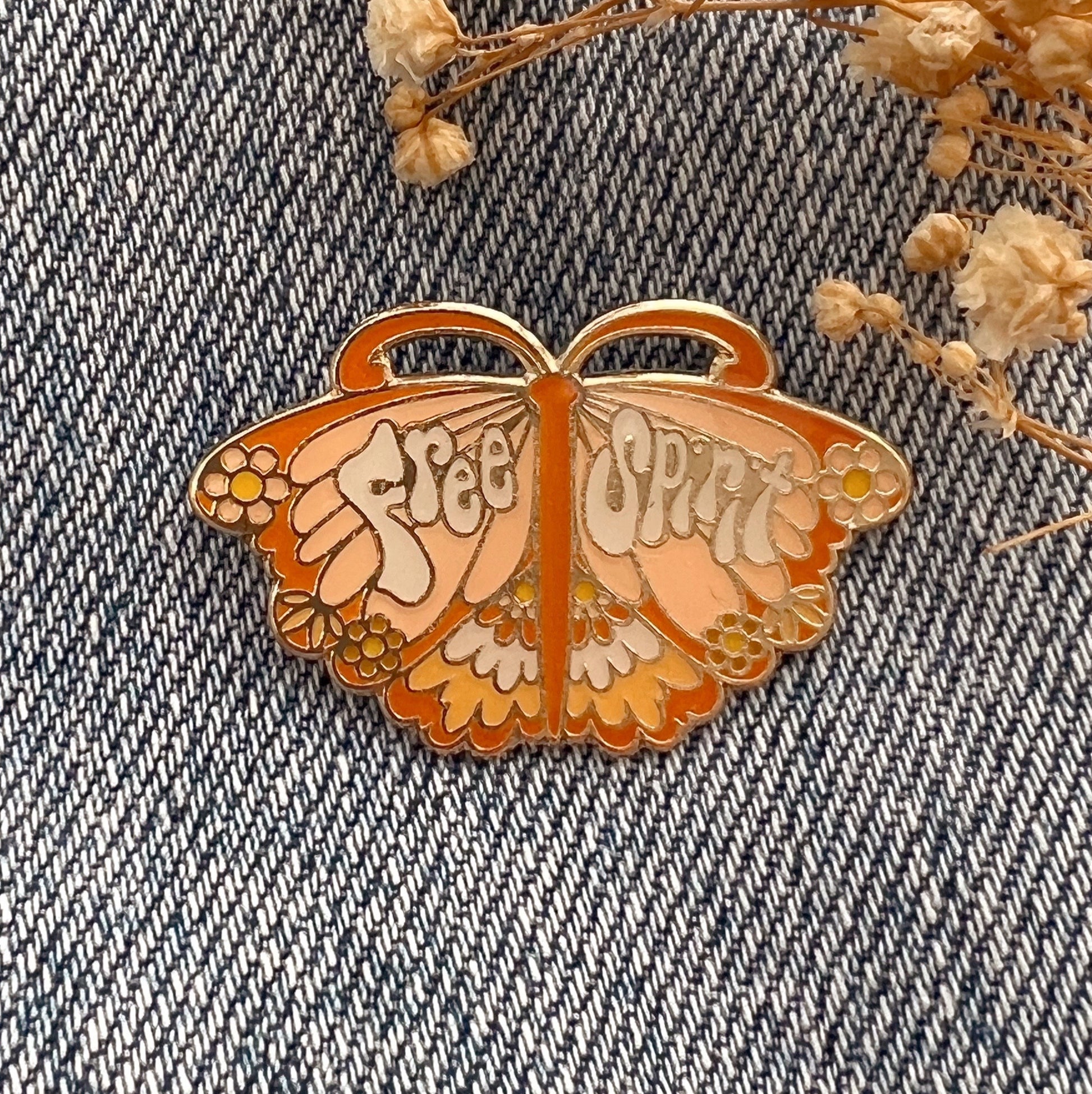 Our 70s inspired butterfly pin calls to all the courageous free spirits! Hard enamel pin features a golden & amber palette detailed with little daisies and the "Free Spirit" quote on its fluttering wings. Crafted in enamel, soft gold tone trim, & a clear epoxy coating for a hint of a retro vibe.