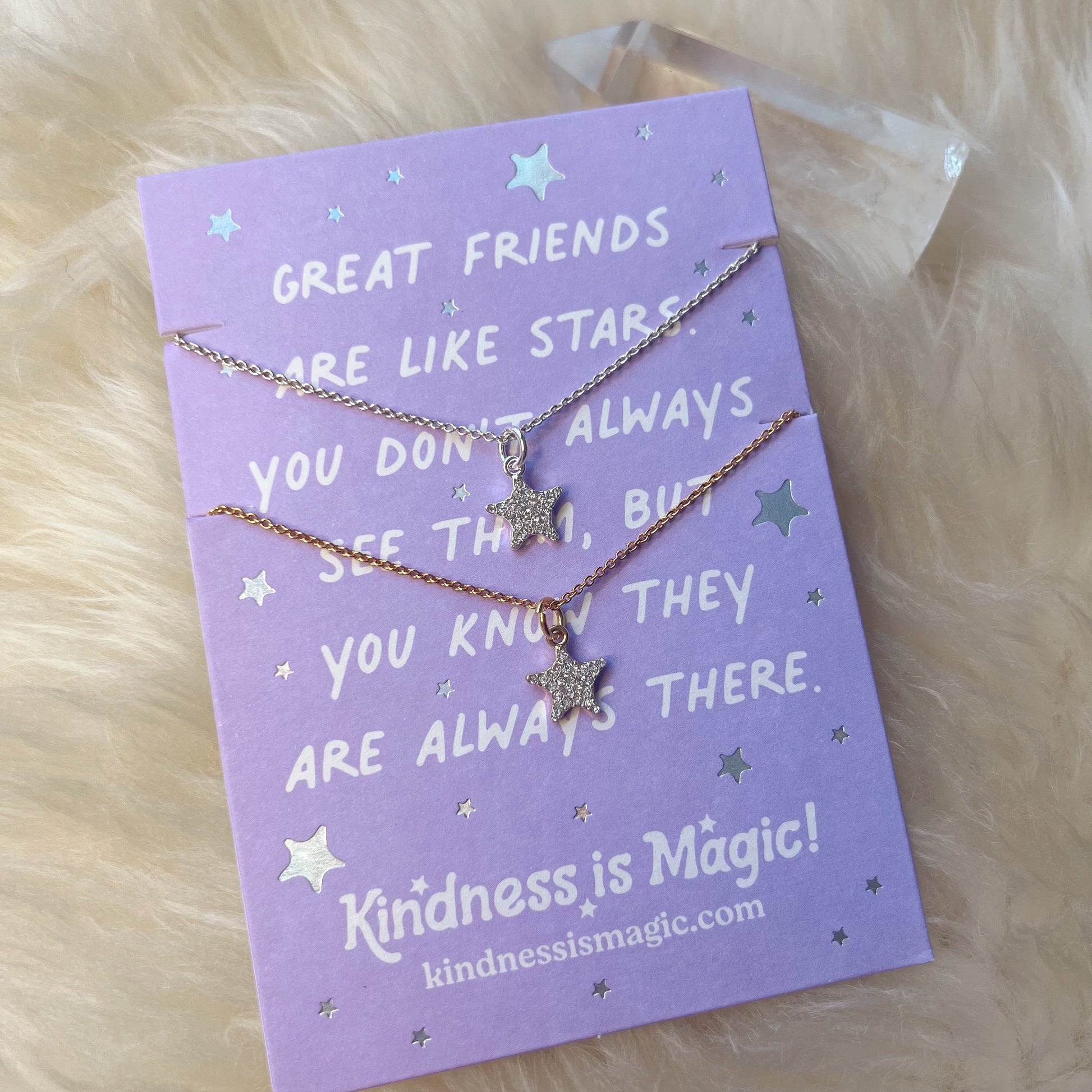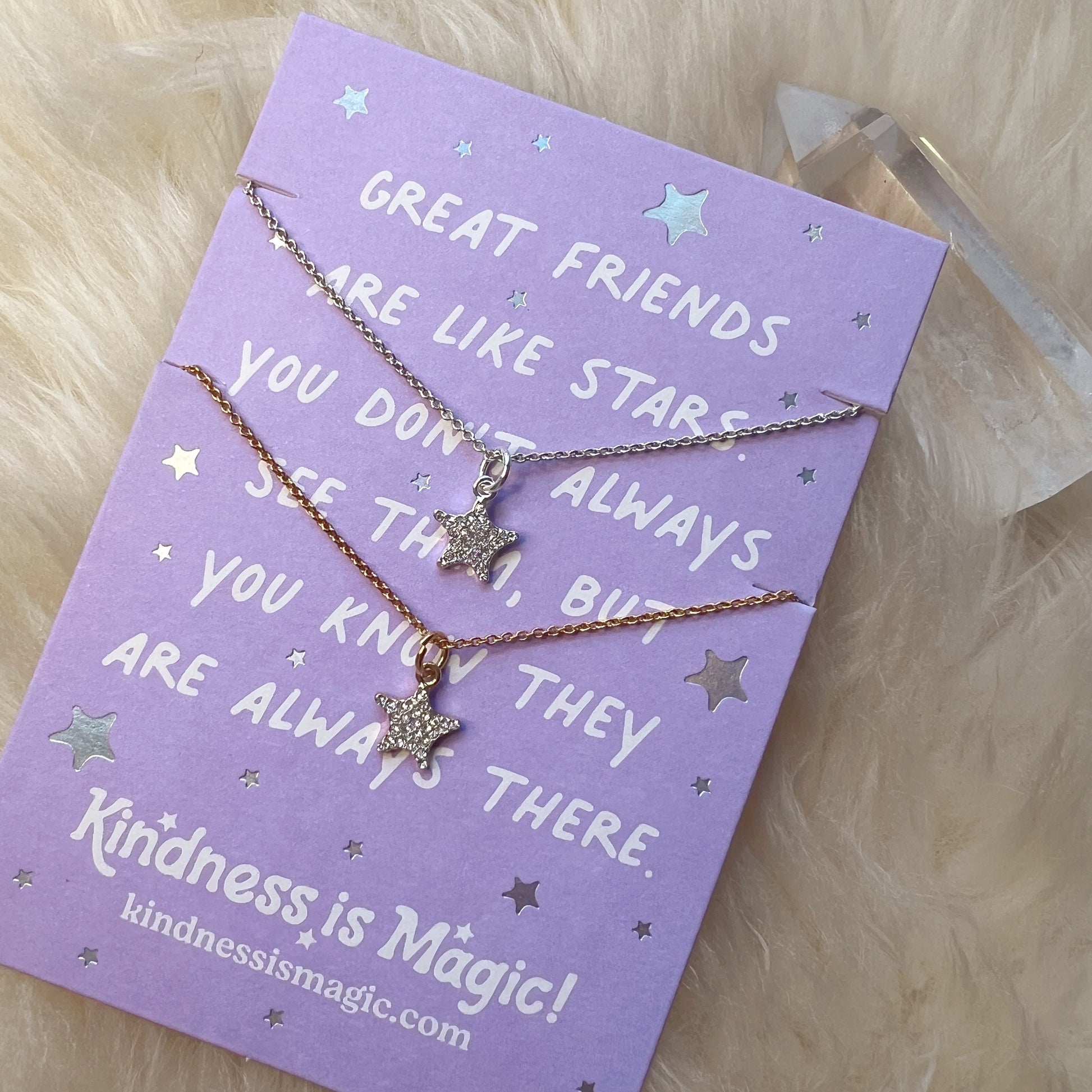 Our friendship necklace is an adorable & thoughtful gift for a friend! Cute tiny stars sparkle with pave crystals & are available in gold or silver. Packaged on a special card that reads, "Great friends are like stars. You don't always see them, but you always know they are there." along with a cute gift pouch.