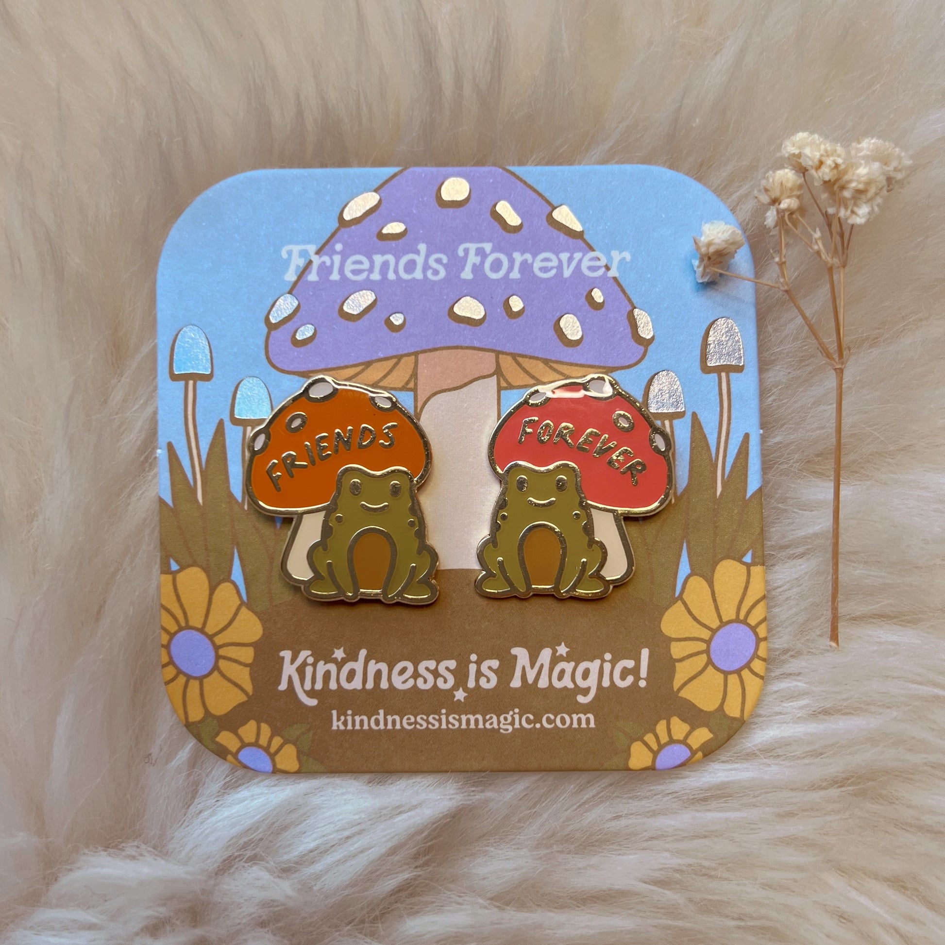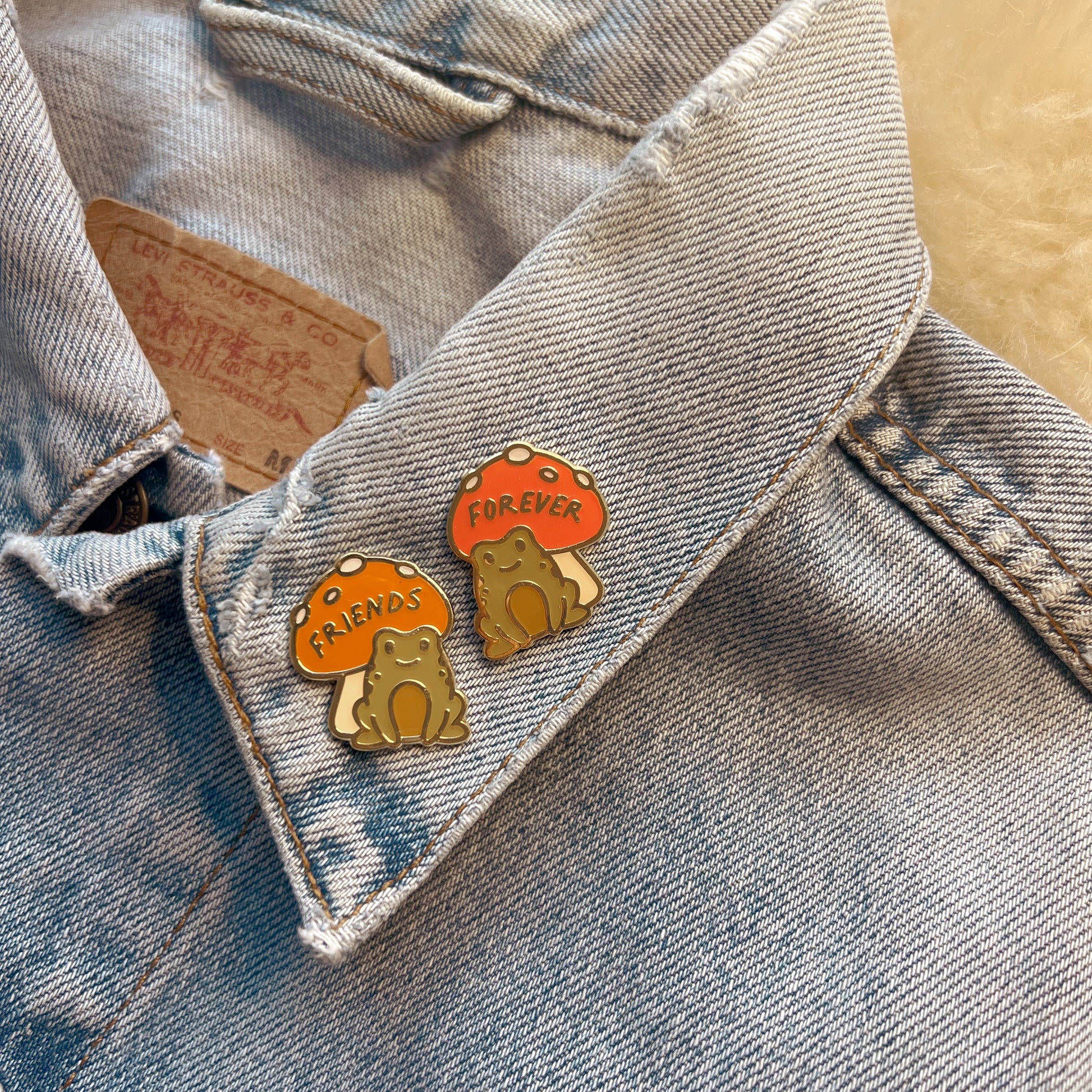 Sweet little "Friends Forever" Frog & Mushroom Enamel Pin Set is the perfect little gift for you & your bestie :) Includes 2 pins - both the cutest lil froggies & their toadstools (1 rust "friends" & 1 red "forever"), packaged on a special card that also reads, "Friends Forever" & is inspired by our cottagecore dreams ♡ Crafted in enamel, soft gold tone trim, & a clear epoxy coating for a hint of a retro vibe.