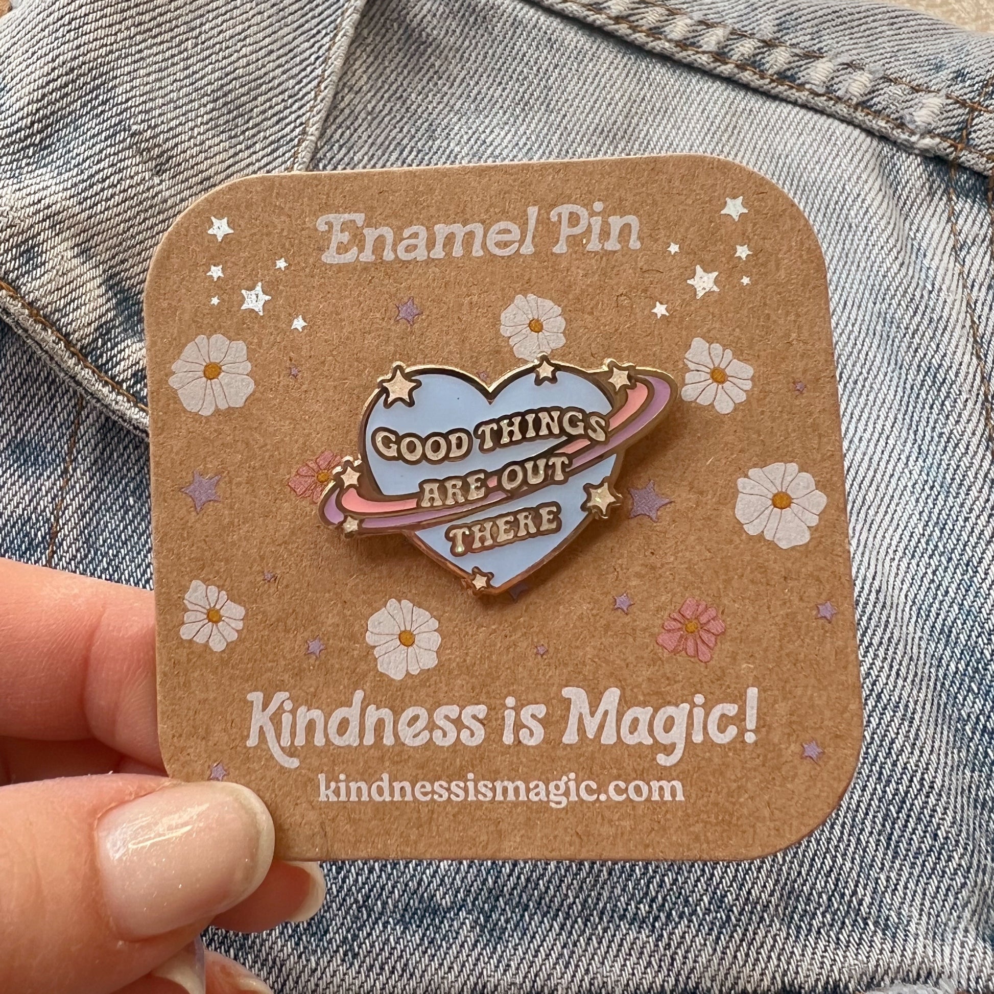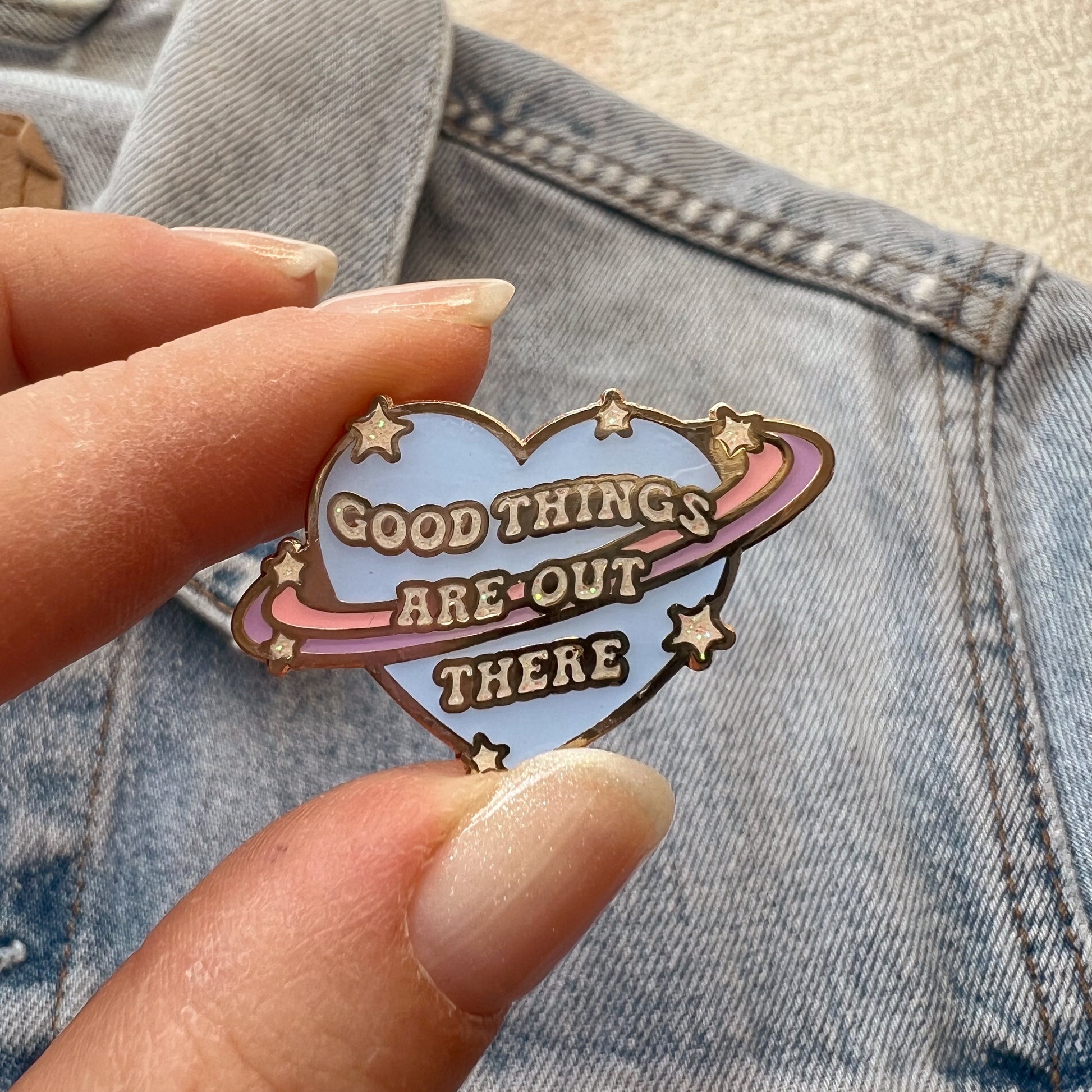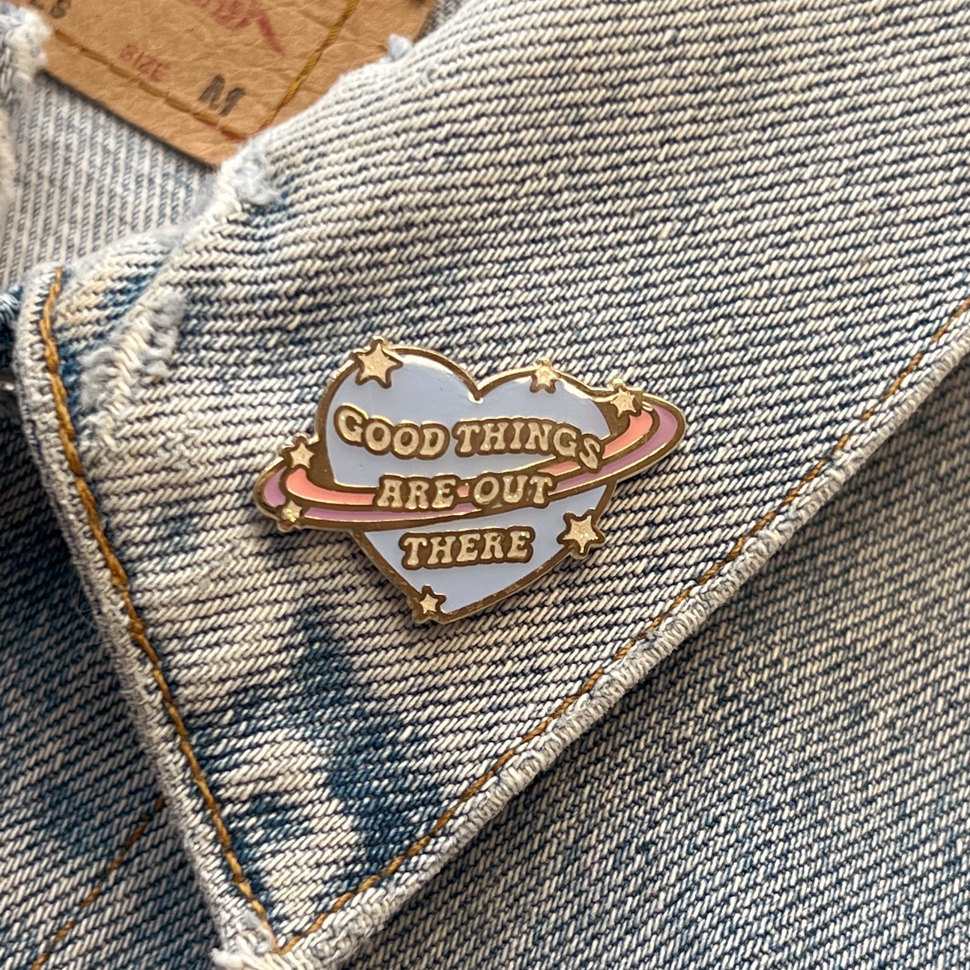 Our planet enamel pin is a gentle little heart shaped reminder that Good Things Are Out Here :) This planet pin has magical space vibes, featuring little twinkling stars against a pastel palette to inspire positivity. Crafted in hard enamel with soft gold tone trim.