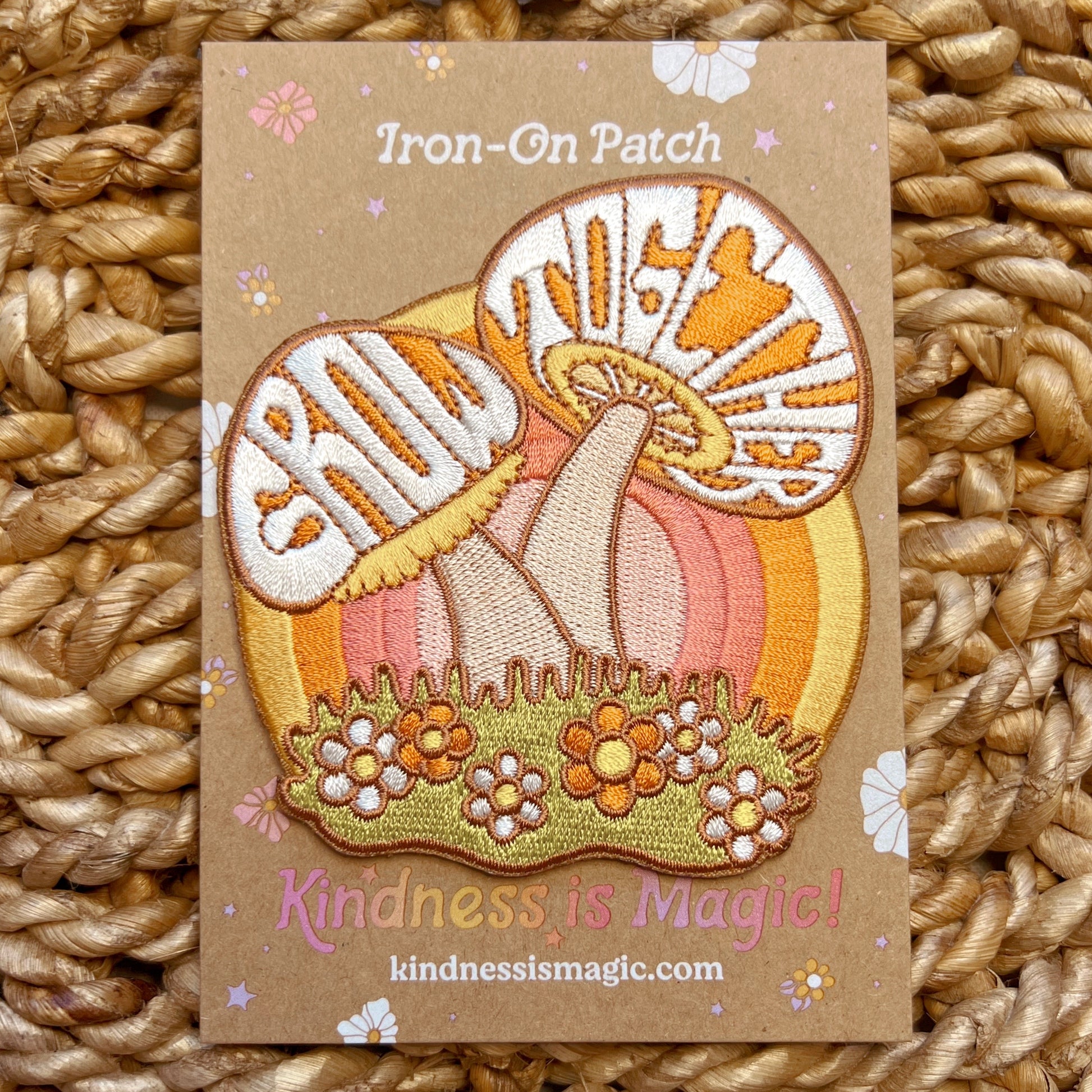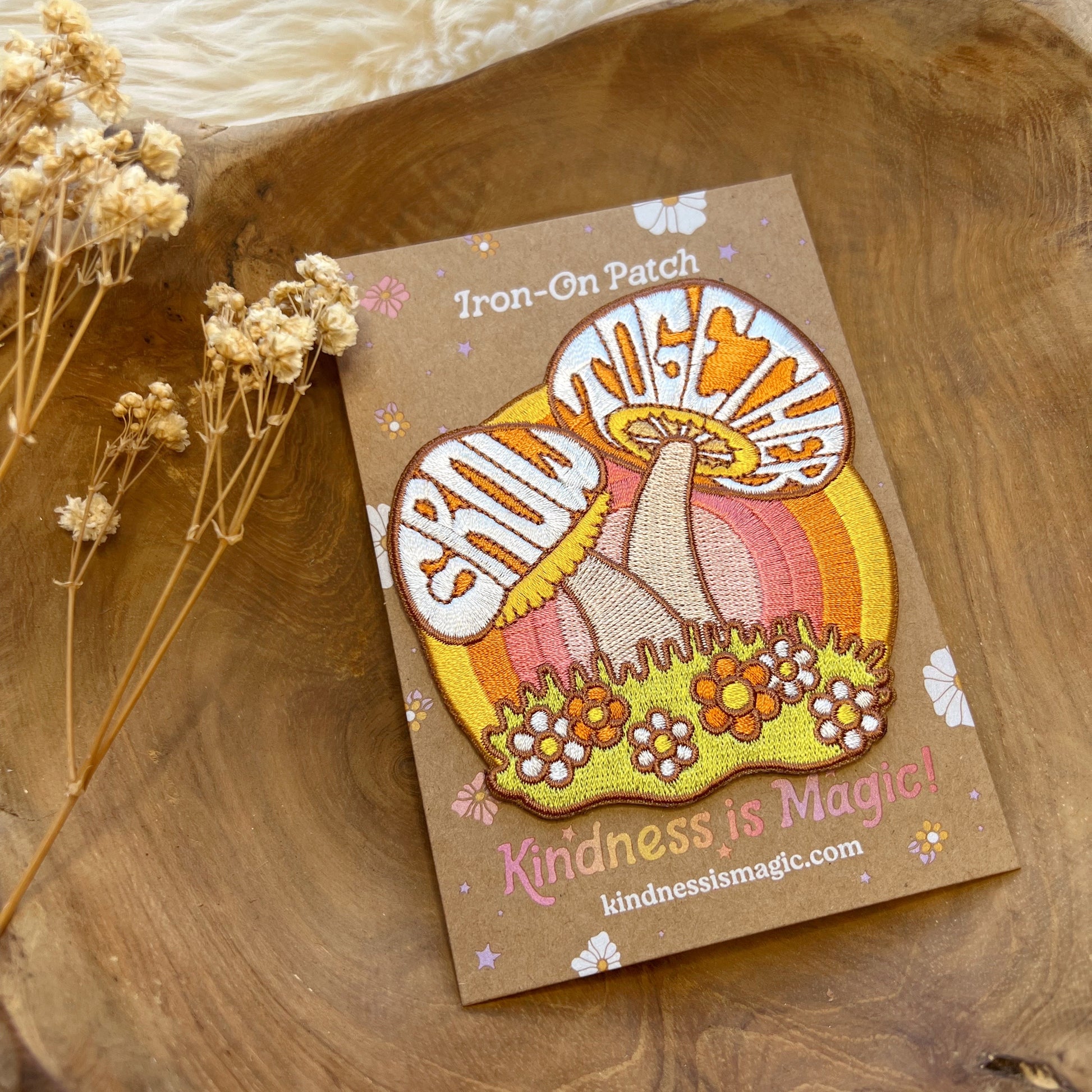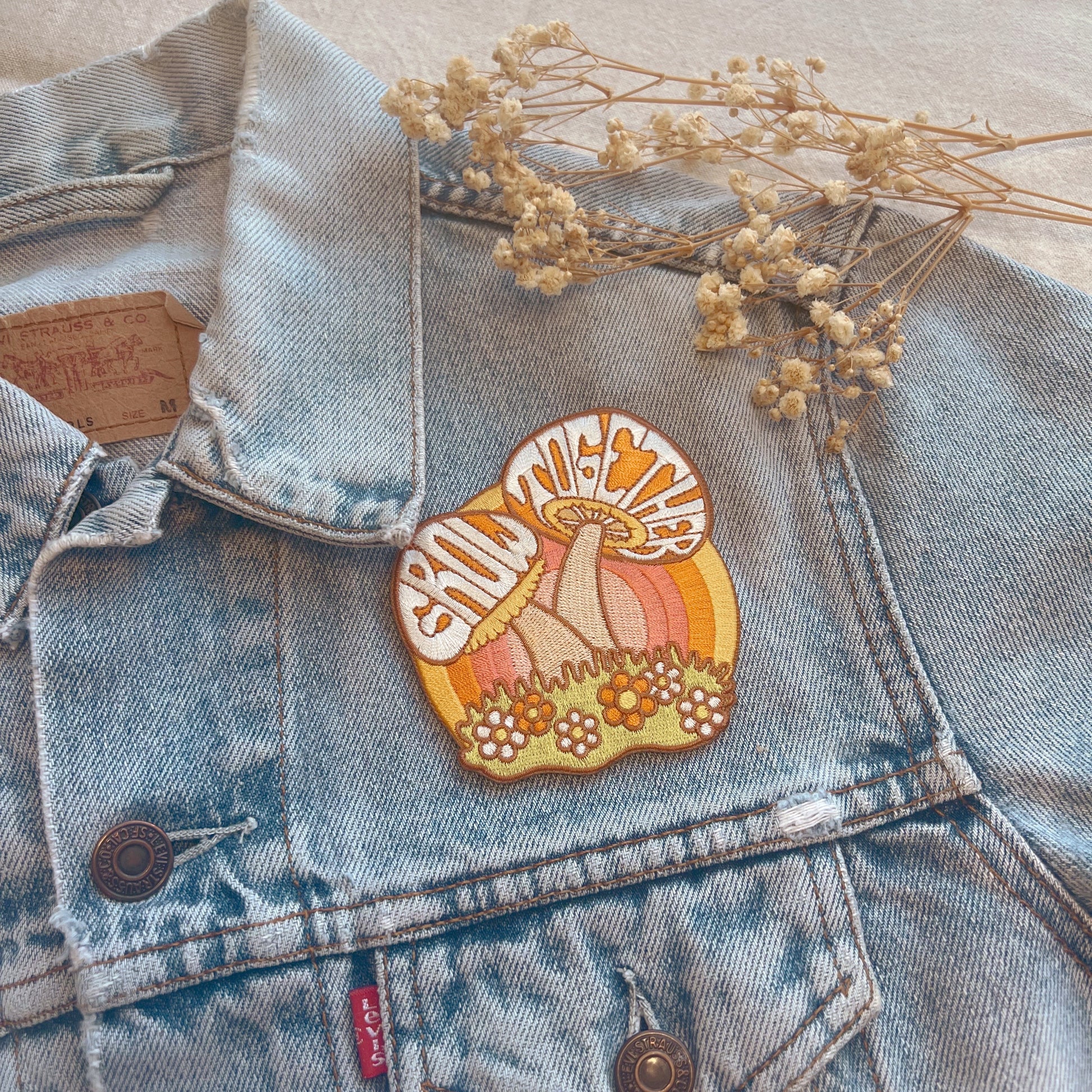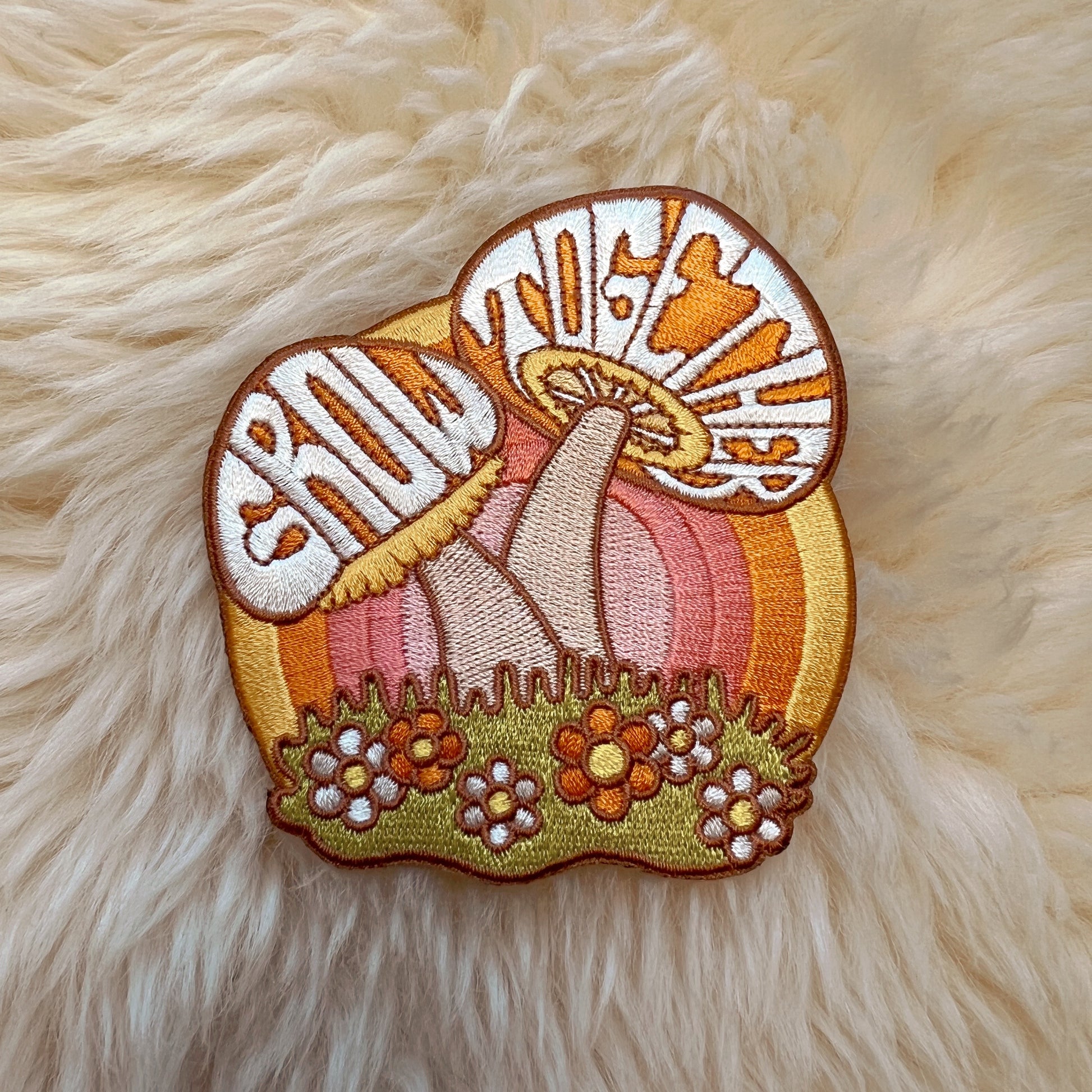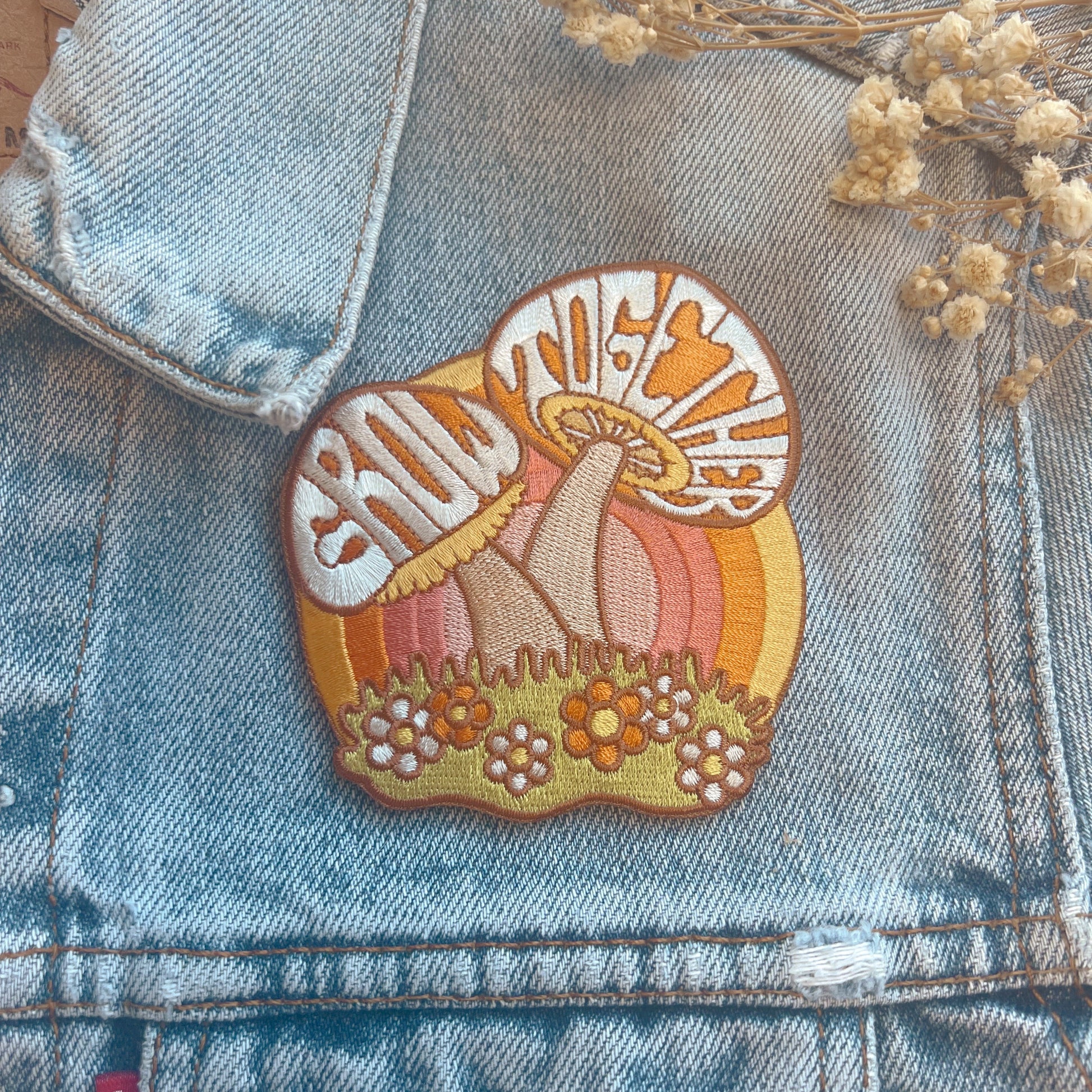 Our patch featuring a couple of lovely mushrooms growing together is a perfect gift for yourself or someone you love! Our embroidered, iron on mushroom patch features the quote, "Grow Together", a subdued 70s retro palette, colorful daisies, and a, awe-inspiring rainbow encouraging you to keep on growing!