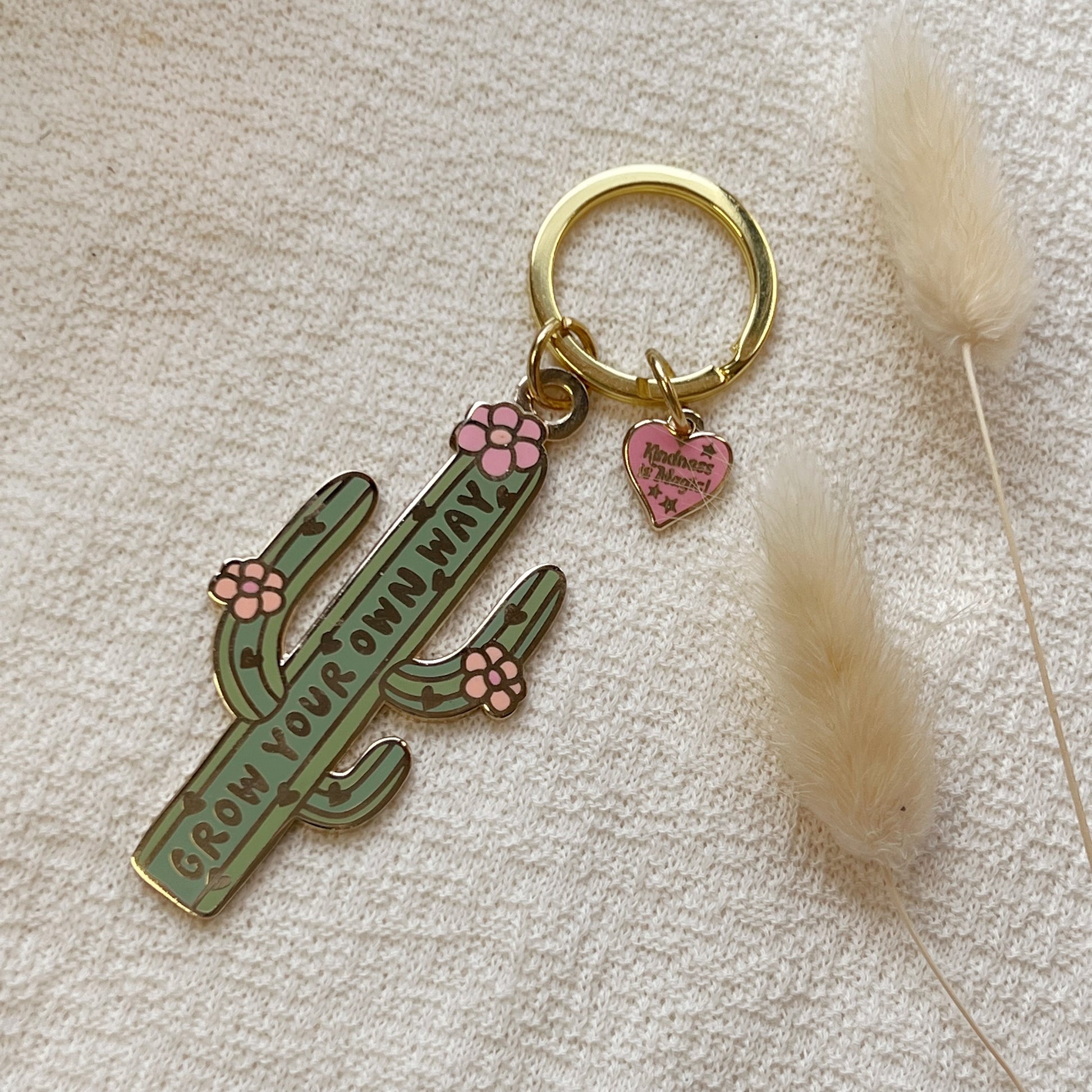 We hope our cute cactus enamel keychain will help to inspire you with a positive affirmation: Grow Your Own Way. Our enamel keychain features an inspirational message on a saguaro cactus with blossoming pink flowers. Crafted in enamel with soft gold tone trim.