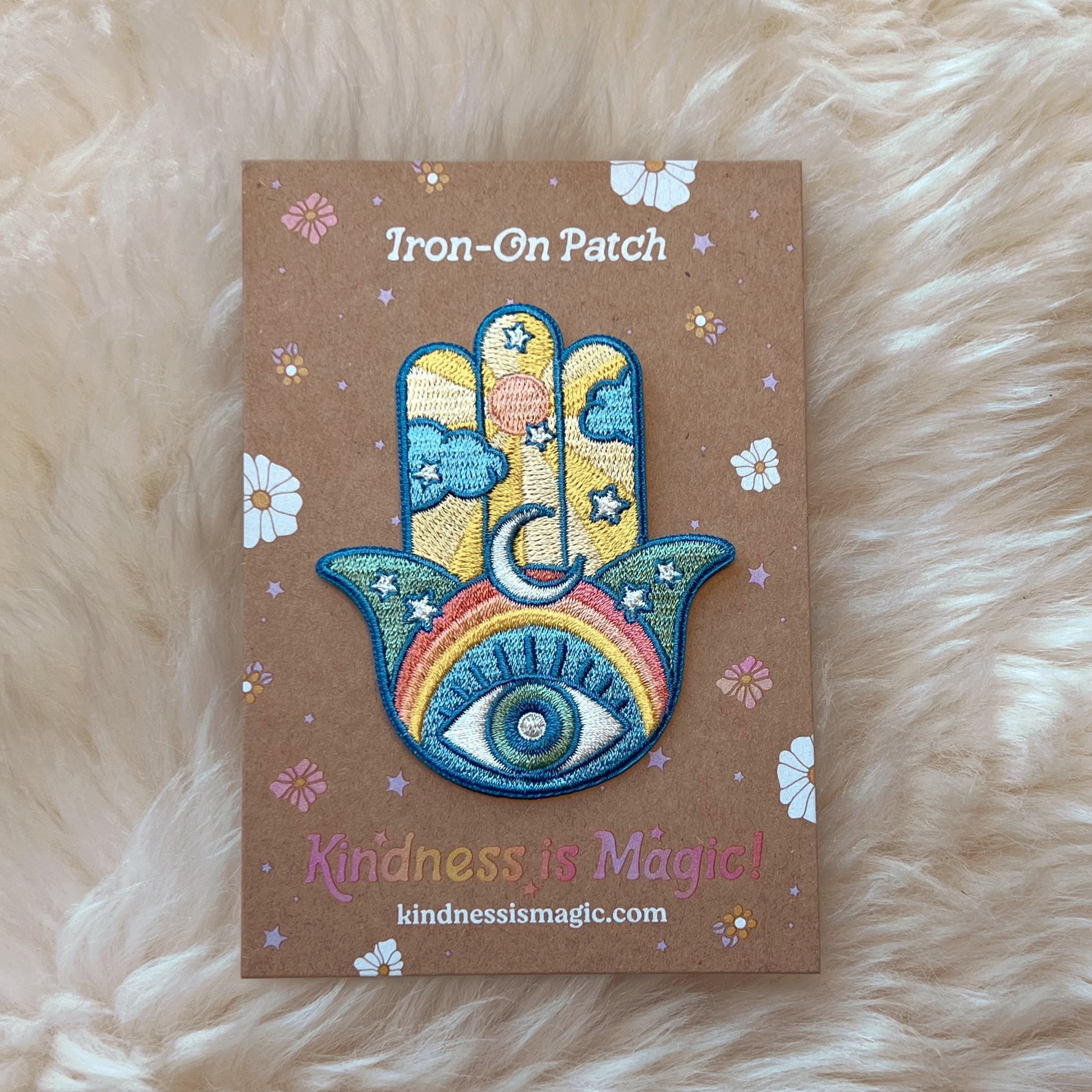 Our hamsa patch is the perfect little talisman to gift yourself or your friends and loved ones ! Our embroidered patch is a peaceful rainbow wonderland that features a colorful palette accented with stars, the sun & moon, and an evil eye that will look out for you ♡
