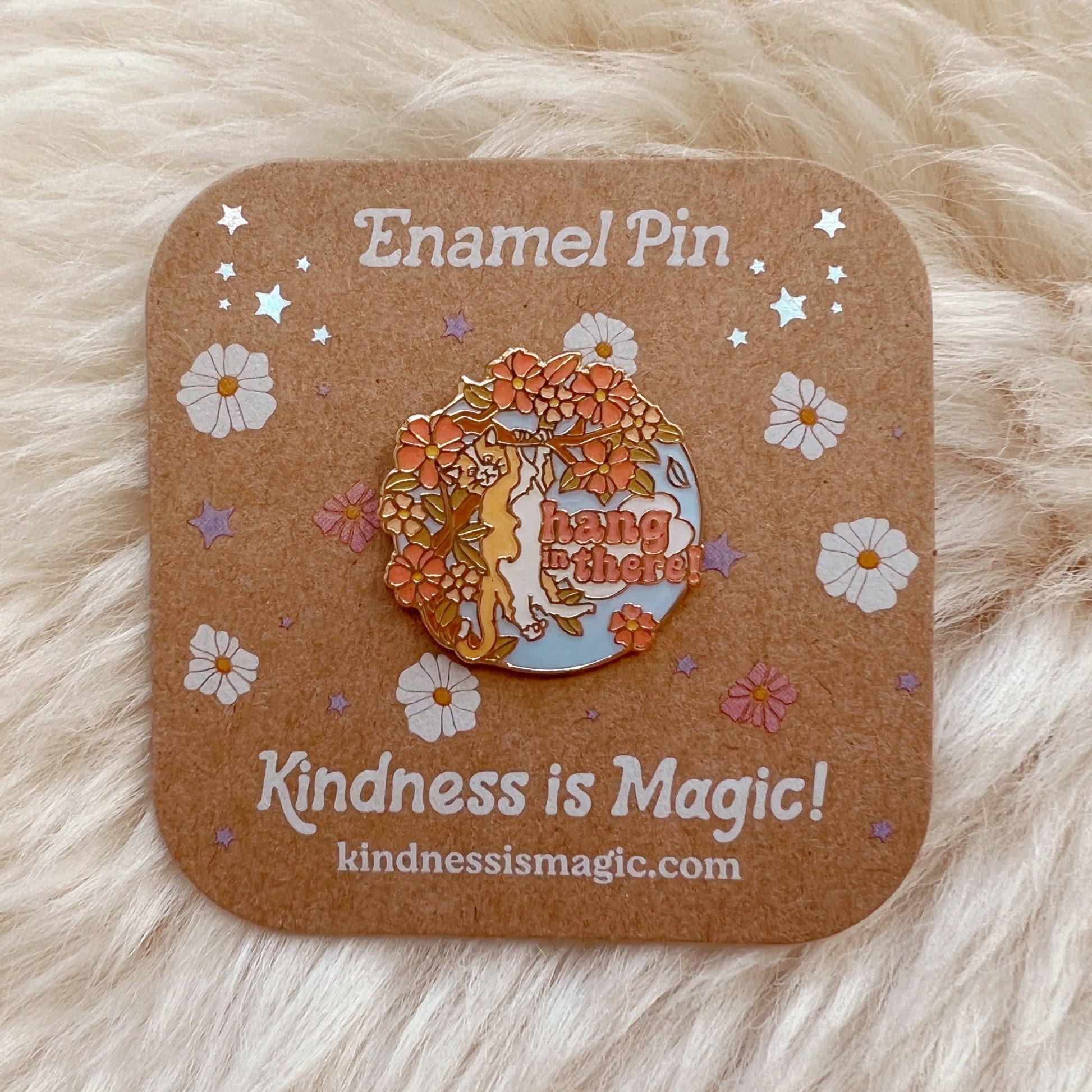 Hang in There! This darling cat pin is an inspiring & thoughtful little gift for you, your loved ones, or any cat lovers! Hard enamel pin is accented with sweet flowers and colorful palette, adding even more cuteness to our hang in there kitten pin. Crafted in enamel, soft gold tone trim, & a clear epoxy coating for a hint of a retro vibe.