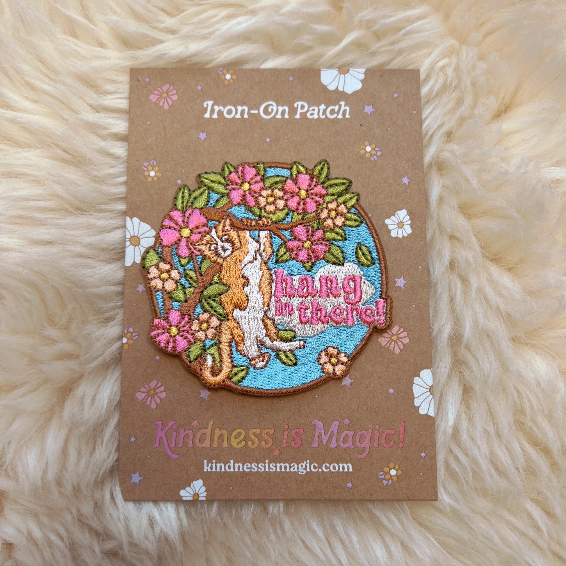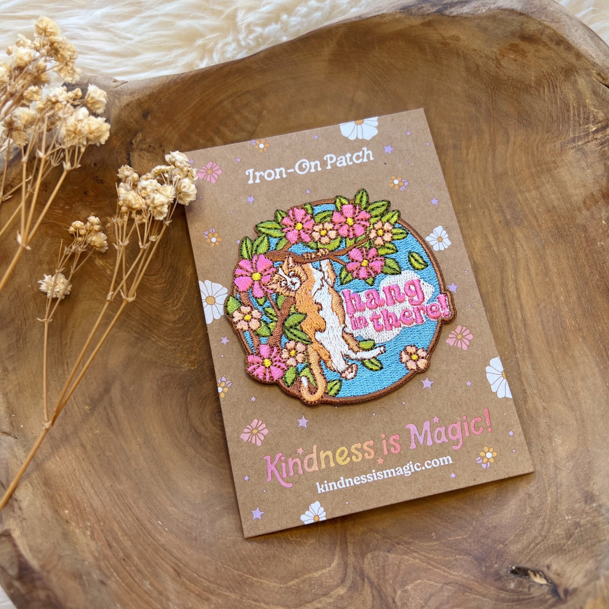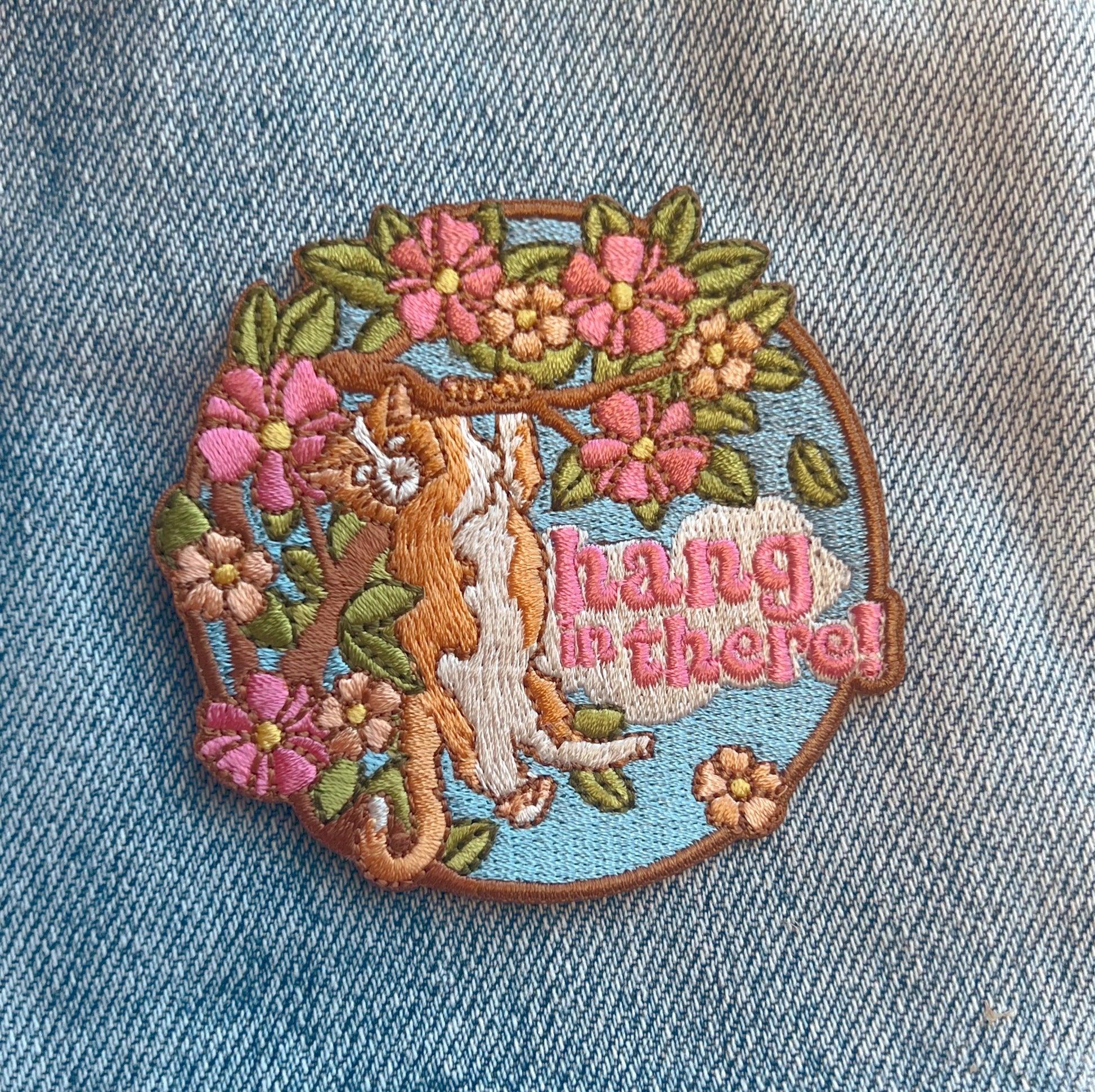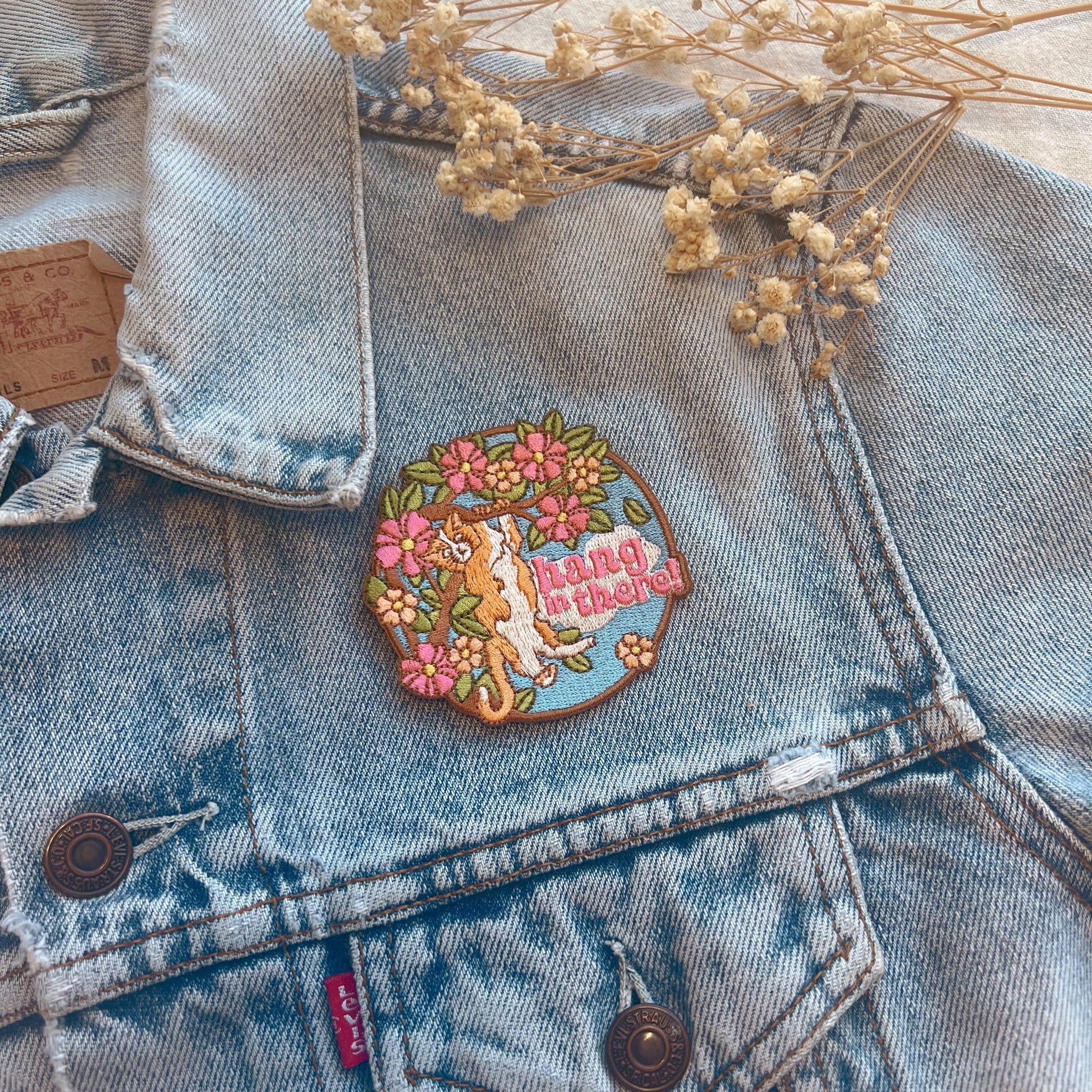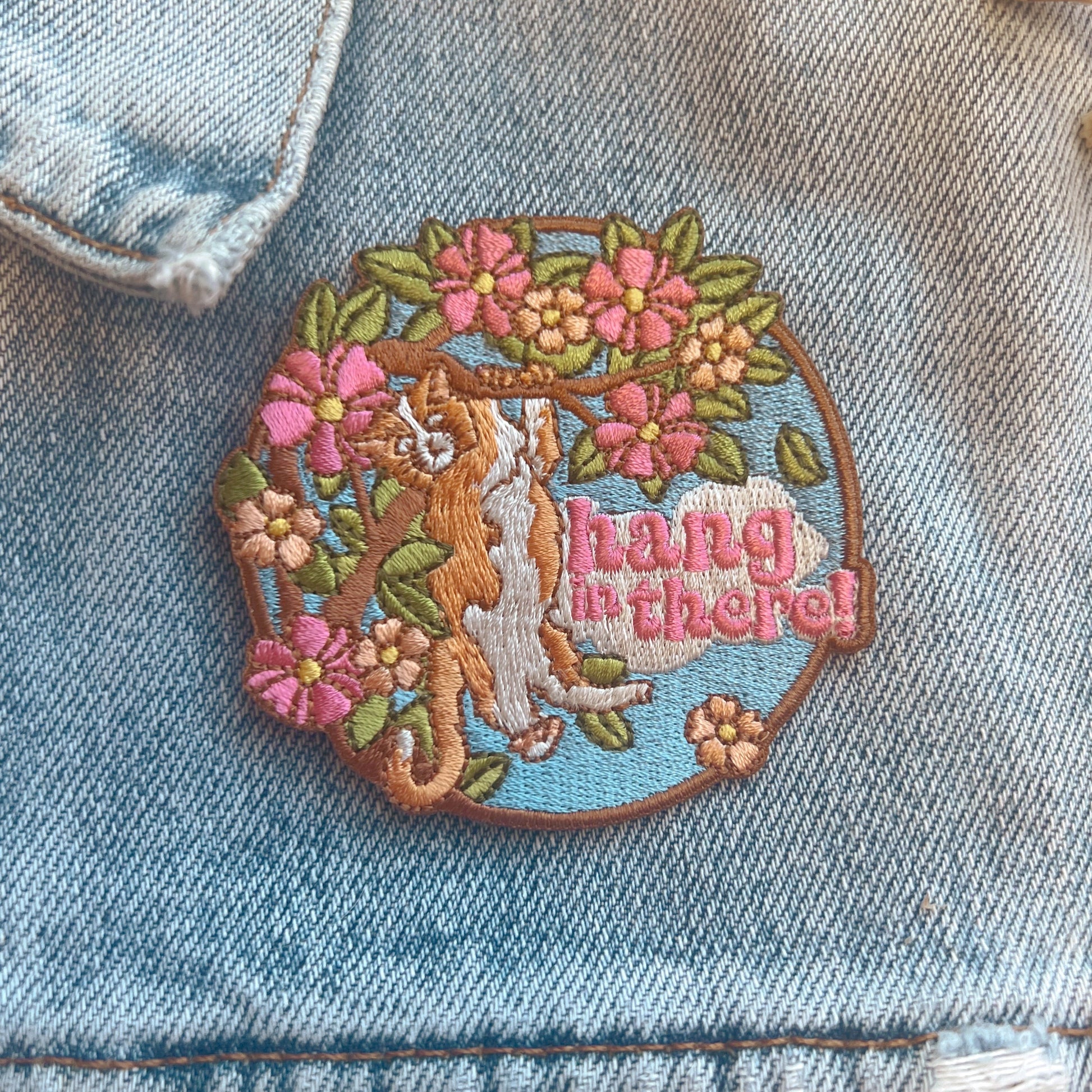 Hang in There! This darling cat patch is an inspiring & thoughtful little gift for you, your loved ones, or any cat lovers! Embroidered iron on patch is accented with sweet flowers and colorful palette, adding even more cuteness to our hang in there kitten patch.