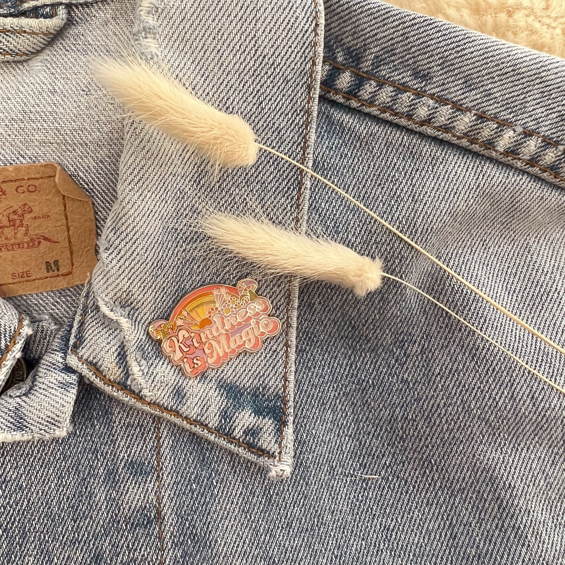 Lift your spirits with this important reminder: Kindness is Magic! Our hard enamel pin features our signature inspirational message & an awe-inspiring rainbow detailed with mushrooms, flowers, and shooting stars in a vibrant palette. Crafted in enamel, soft gold tone trim, & a clear epoxy coating for a hint of a retro vibe.