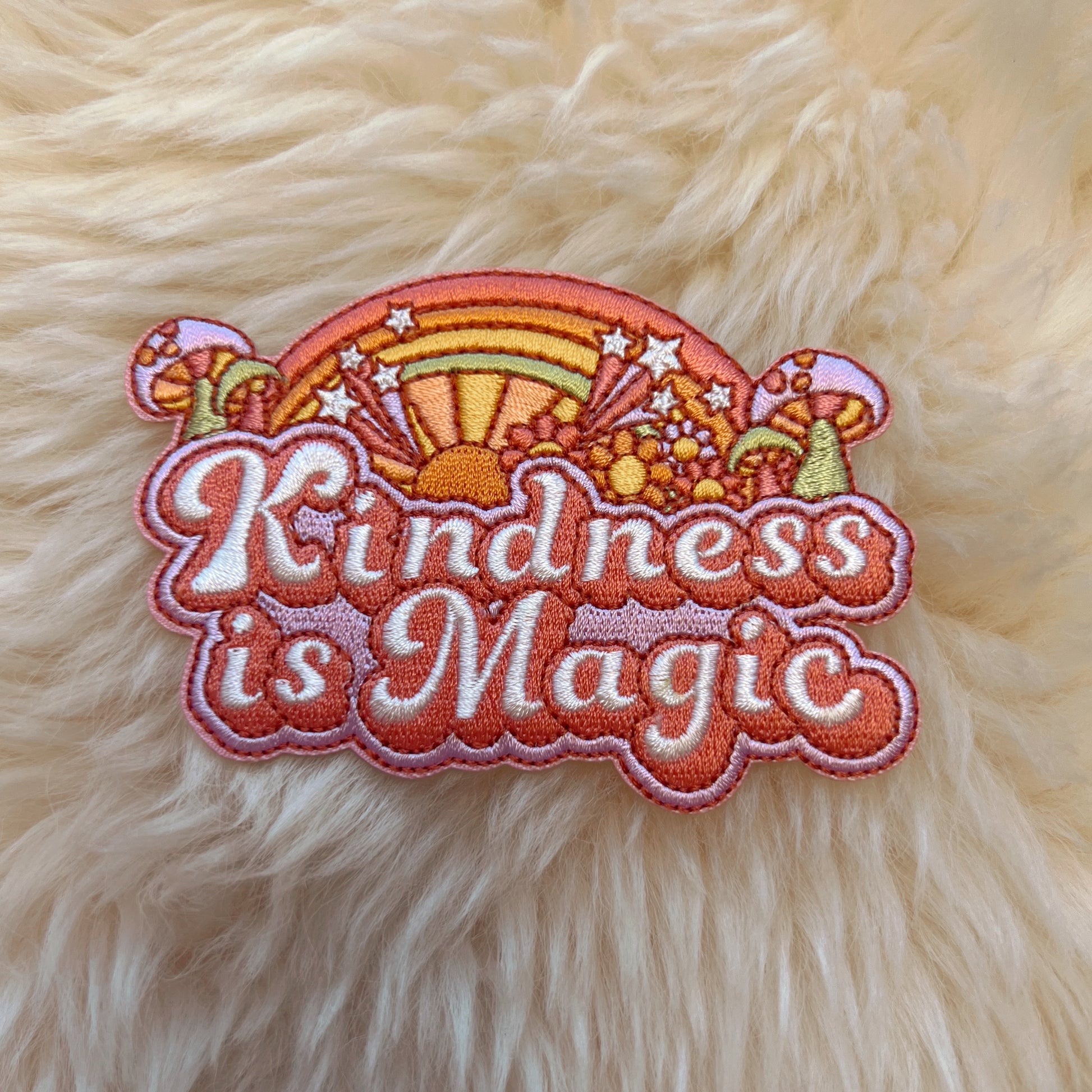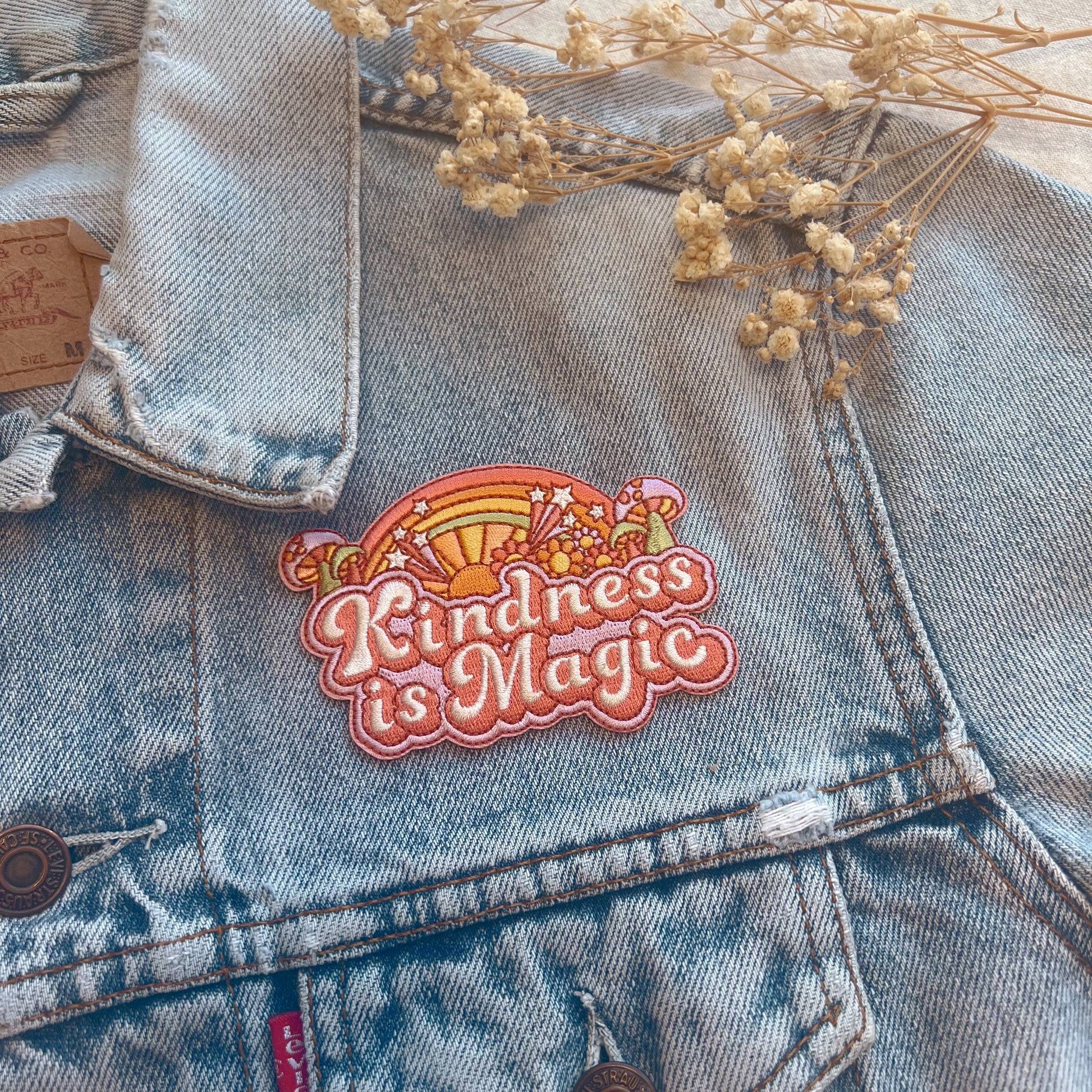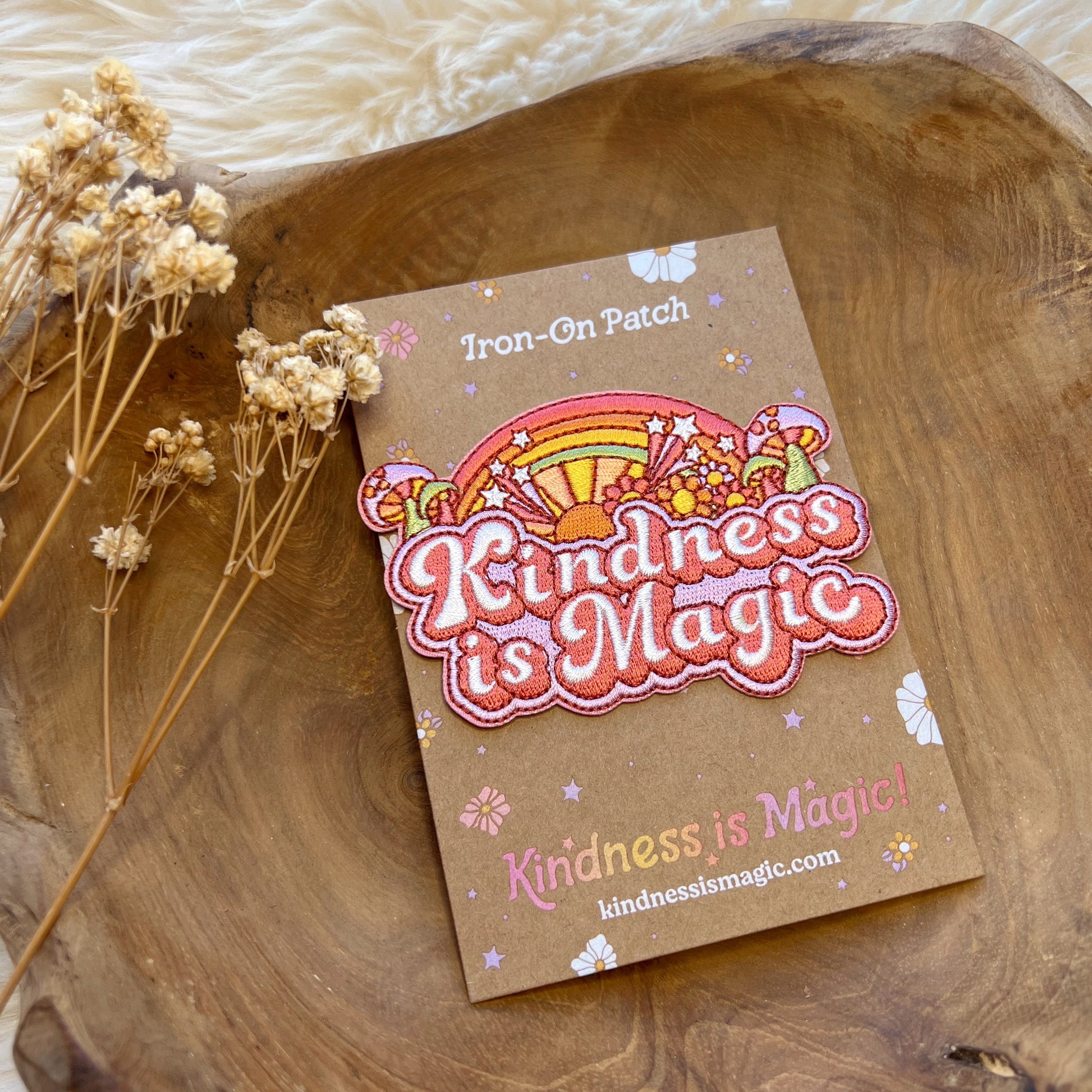 Lift your spirits with this important reminder: Kindness is Magic! Our embroidered, iron on patch features our signature inspirational message & an awe-inspiring rainbow accented with mushrooms, flowers, and shooting stars in a vibrant palette.