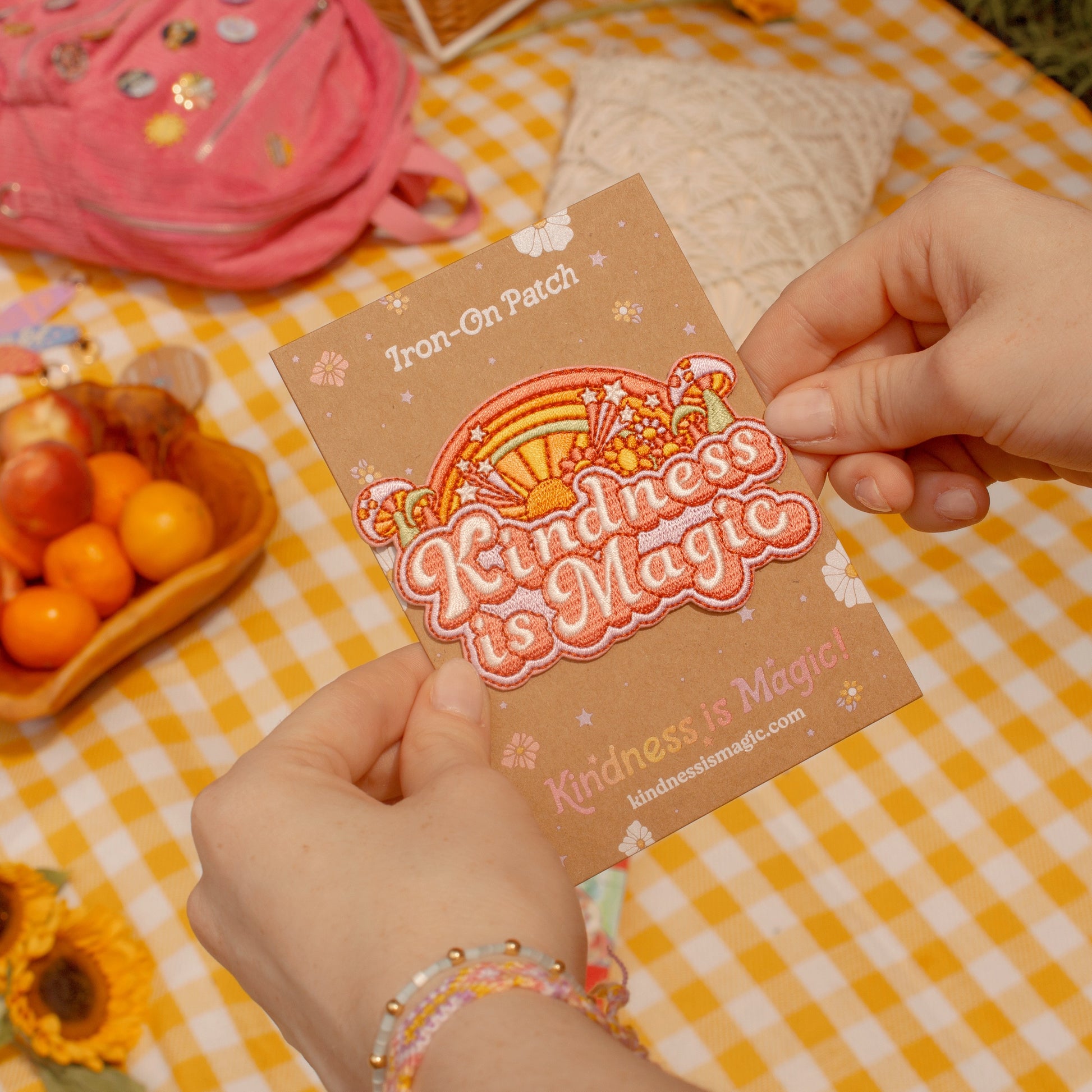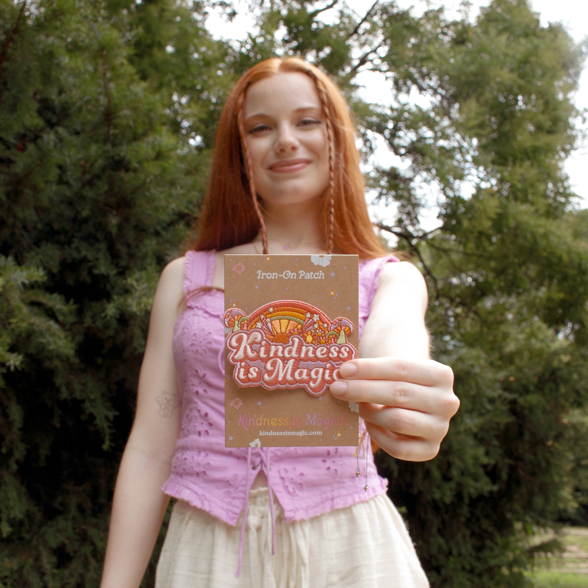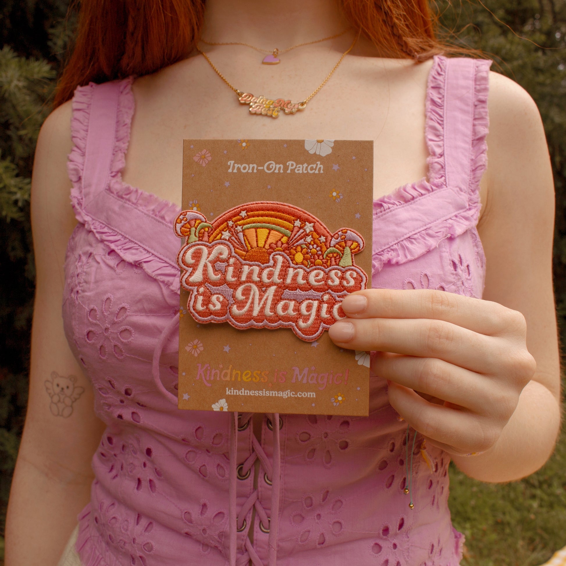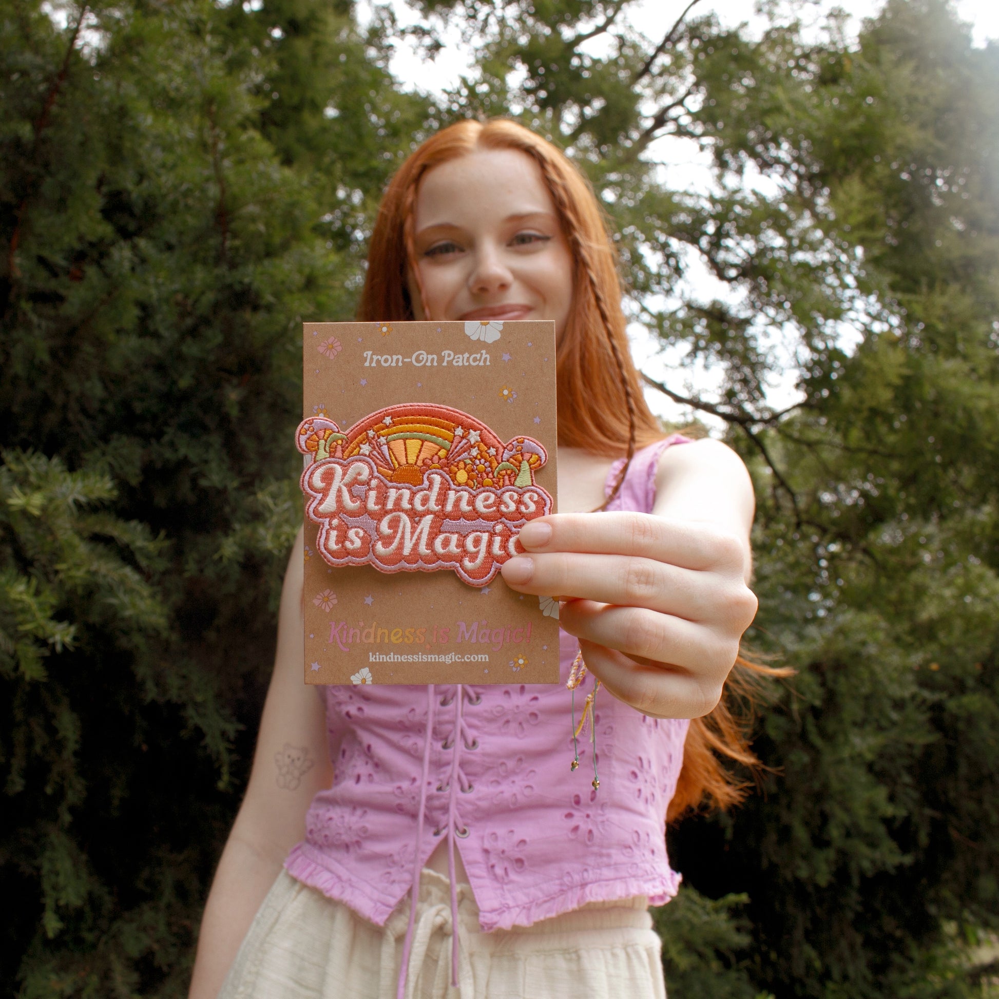 Lift your spirits with this important reminder: Kindness is Magic! Our embroidered, iron on patch features our signature inspirational message & an awe-inspiring rainbow accented with mushrooms, flowers, and shooting stars in a vibrant palette.