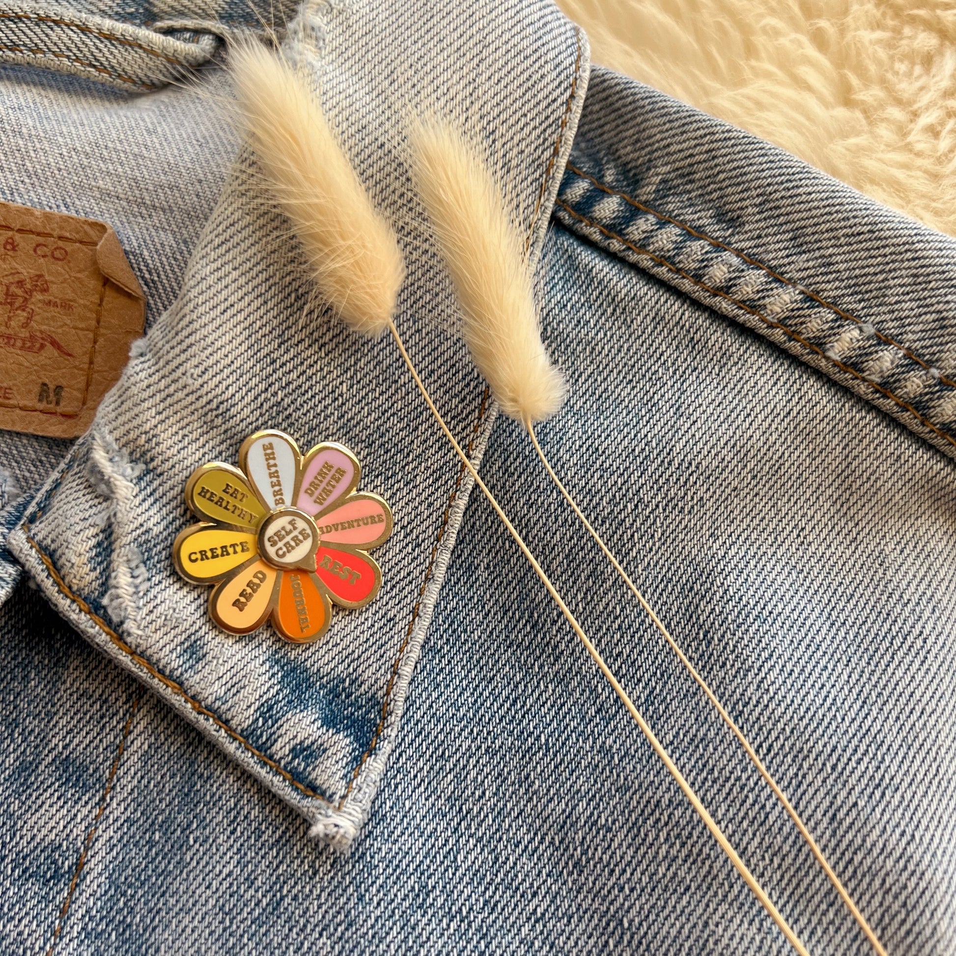 Our Self Care Spinner Enamel Pin is the perfect thoughtful gift, with sweet little reminders to treat yourself better. Hard enamel pin comes in a vibrant palette and phrases like "drink water, adventure, rest, journal, read, create, eat healthy, and breathe" ♡ Crafted in enamel, soft gold tone trim, & a clear epoxy coating for a hint of a retro vibe.